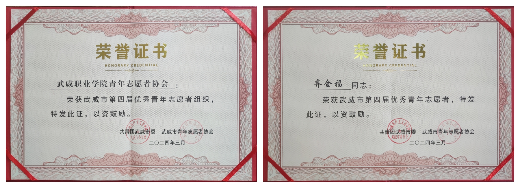 會議全面總結(jié)了2023年全市青年志愿服務(wù)工作情況,對獲得武威市第四屆優(yōu)秀志愿者組織和個人的集體和單位頒發(fā)榮譽(yù)證書。我校青年志愿者協(xié)會被評為“優(yōu)秀志愿者組織”,工程技術(shù)學(xué)院學(xué)生齊金福被評為“優(yōu)秀志愿者”。