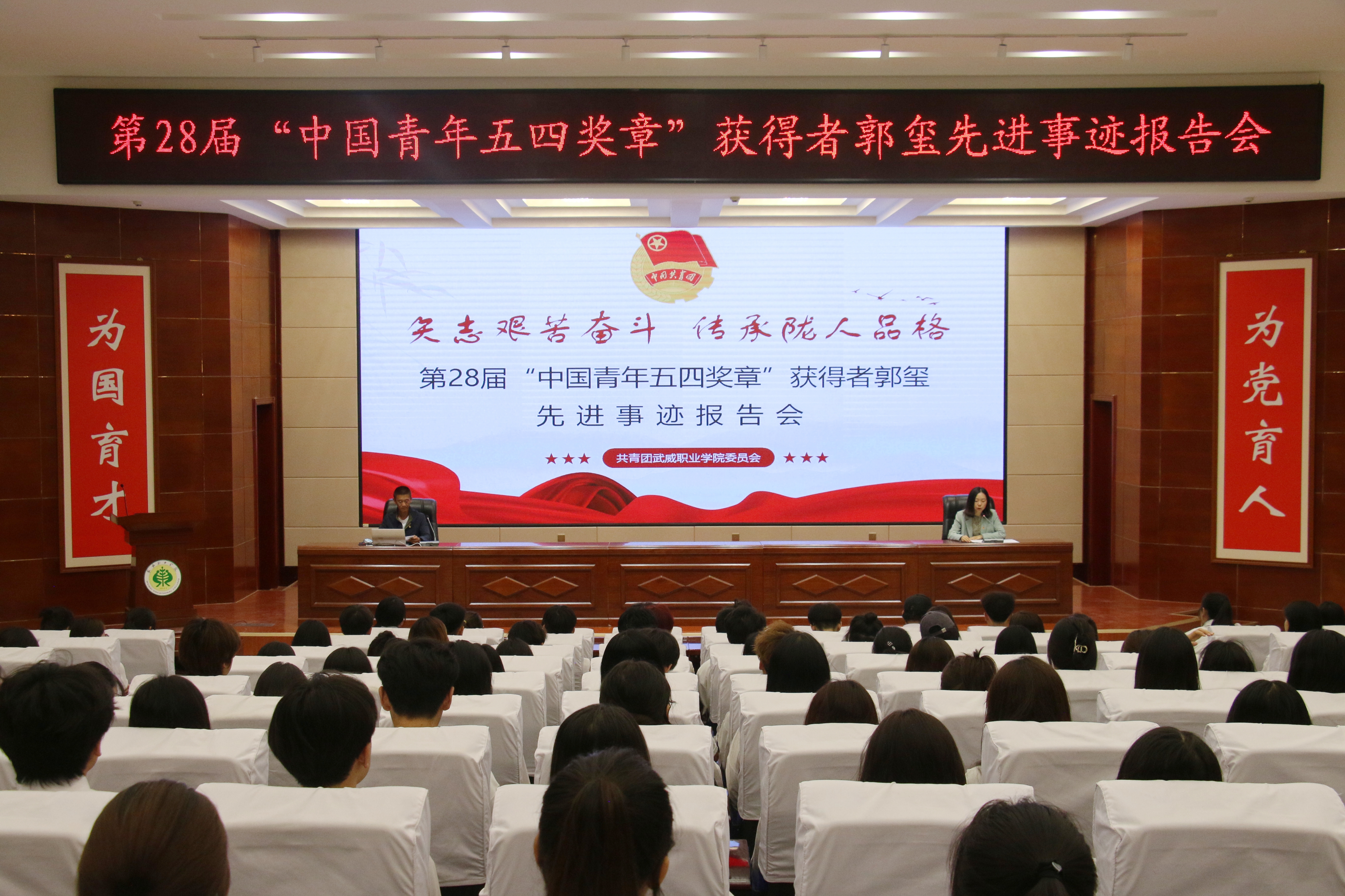 為進一步引導(dǎo)和激勵團員青年踔厲奮發(fā)、篤行不怠,厚植奮斗底色,5月24日,學(xué)校在菁英廳舉行“矢志艱苦奮斗傳承隴人品格”第28屆“中國青年五四獎?wù)隆眰€人先進事跡報告會。學(xué)校邀請第28屆“中國青年五四獎?wù)隆鲍@得者——郭璽同志出席活動,并作了“三代青春鑄綠洲”主題宣講報告。學(xué)?!扒囫R工程”培訓(xùn)班學(xué)員、優(yōu)秀學(xué)生代表共計220余人參加報告會。會議由團委副書記謝麗霞主持。