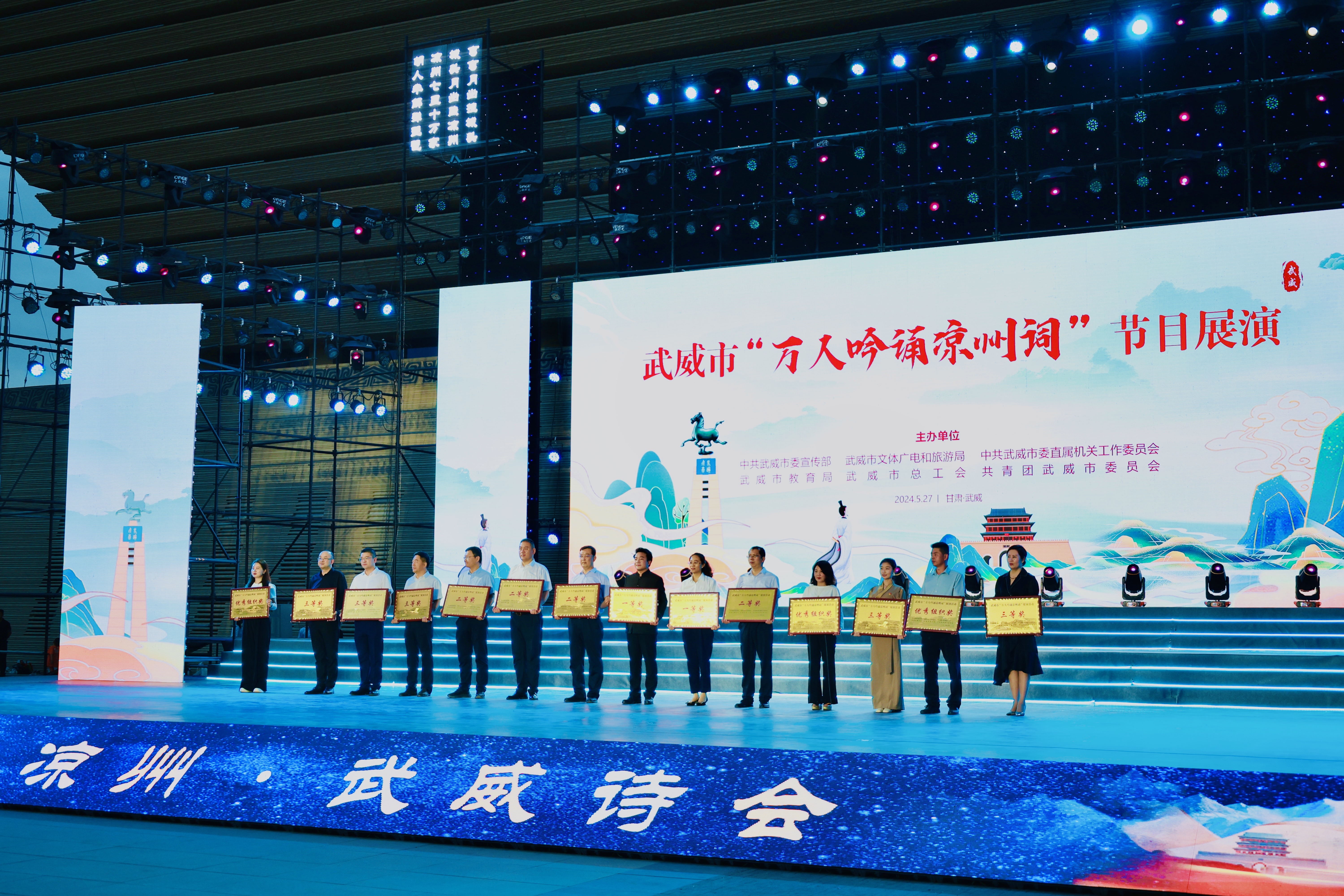 5月27日晚,武威市“萬人吟誦涼州詞”優(yōu)秀節(jié)目展演活動在漢唐天馬城大漢賦館前舉行,并為“萬人吟誦涼州詞”比賽中的優(yōu)秀作品頒獎。學校選送的節(jié)目《詩意涼州·迤邐踏歌》在15個展演節(jié)目中榮獲一等獎。
