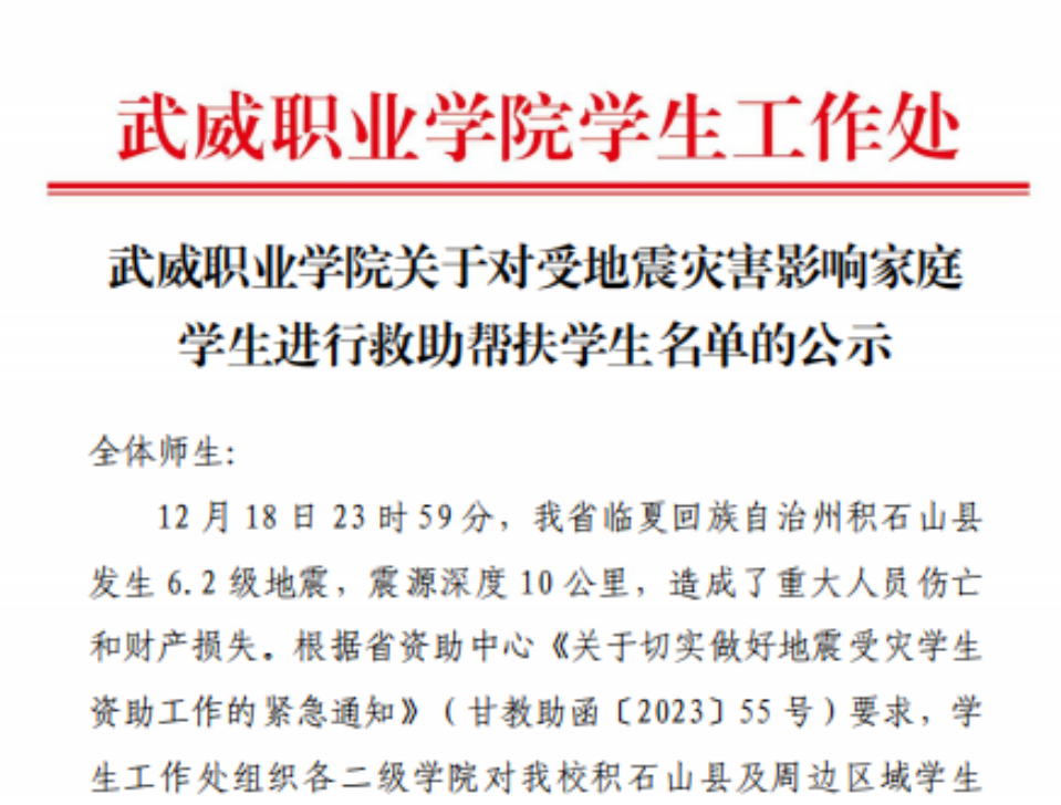 12月18日23時(shí)59分,我省臨夏回族自治州積石山縣發(fā)生6.2級地震。地震發(fā)生后,學(xué)校高度重視災(zāi)區(qū)學(xué)生家庭受災(zāi)情況,密切關(guān)注各項(xiàng)災(zāi)情的發(fā)展變化,第一時(shí)間對積石山縣及周邊區(qū)域地震受災(zāi)家庭學(xué)生情況進(jìn)行摸排,迅速啟動(dòng)救助幫扶關(guān)愛工作。