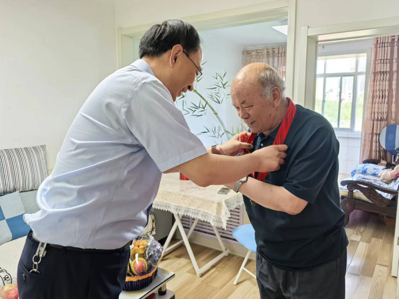 在擁有50年黨齡的退休教師秦光善家中,黨委書(shū)記王宏為他頒發(fā)了“光榮在黨50年”紀(jì)念章,并表達(dá)了深深的感謝,同時(shí)叮囑他要保重身體,遇到困難及時(shí)向組織反映。