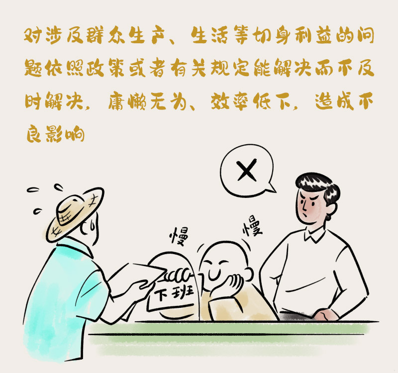 (一)對(duì)涉及群眾生產(chǎn)、生活等切身利益的問題依照政策或者有關(guān)規(guī)定能解決而不及時(shí)解決,庸懶無為、效率低下,造成不良影響;