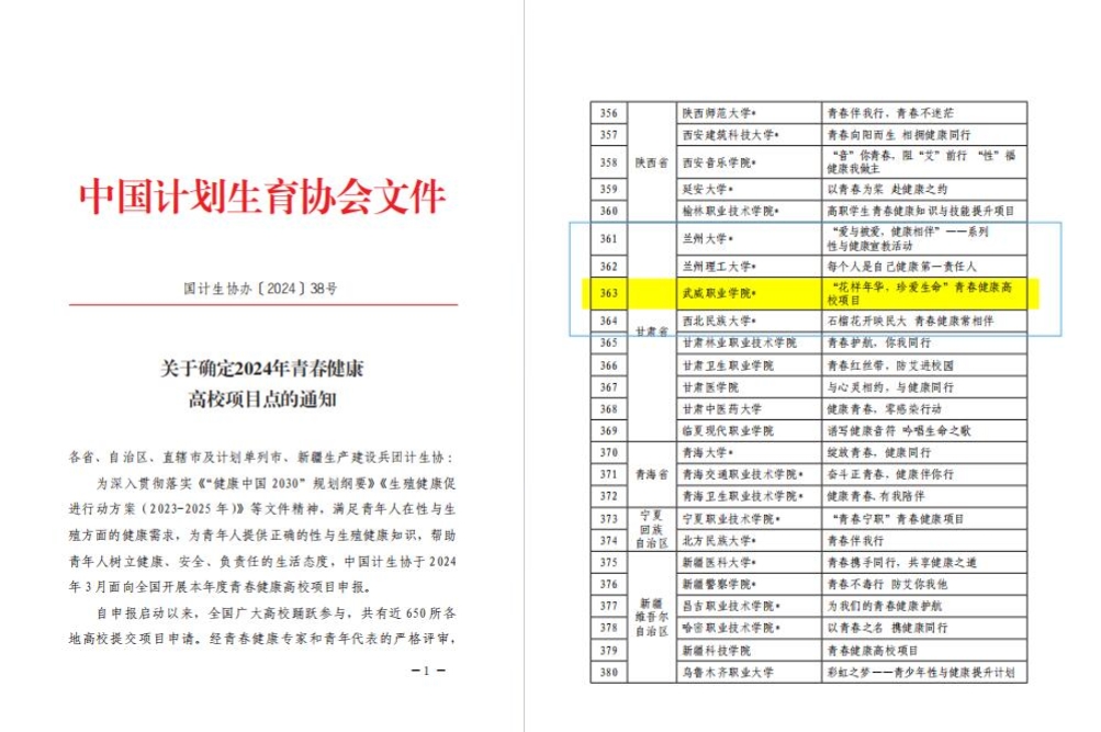 日前,中國(guó)計(jì)劃生育協(xié)會(huì)發(fā)布《關(guān)于確定2024年青春健康高校項(xiàng)目點(diǎn)的通知》,我校學(xué)生工作部、校團(tuán)委、護(hù)理學(xué)院共同申報(bào)的“花樣年華,珍愛生命”項(xiàng)目,從全國(guó)各地500余所高校中脫穎而出,自2022年以來(lái)連續(xù)三次成功中標(biāo)中國(guó)計(jì)生協(xié)專項(xiàng)資助A類項(xiàng)目,成為甘肅省中標(biāo)A類項(xiàng)目院校中唯一一所高職院校。