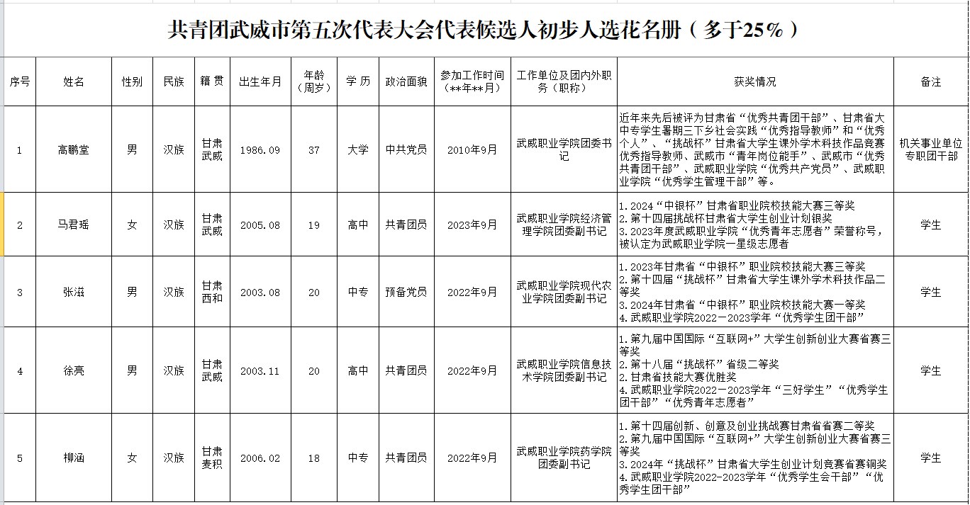 根據(jù)《關(guān)于中國共產(chǎn)主義青年團武威市第五次代表大會代表選舉工作的通知》文件精神,分配武威職業(yè)學(xué)院團委(選舉單位)代表4名。按照代表推薦資格條件、結(jié)構(gòu)比例及程序要求,經(jīng)過前期民主推薦、資格初審、組織醞釀研究,按高于30%的差額比例,提出了候選人初步人選考察對象6名。