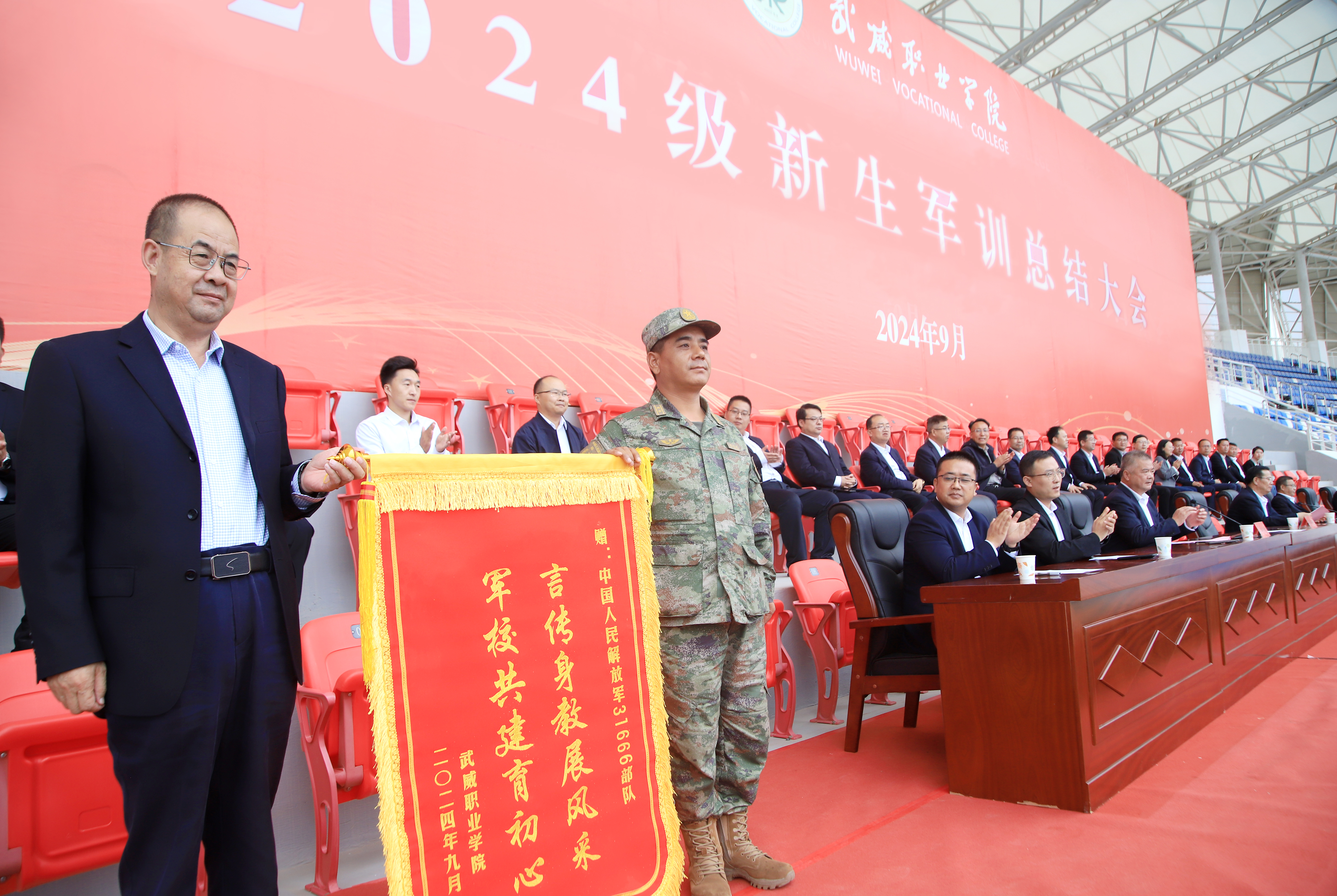 會(huì)上,翟存祥代表學(xué)校向承訓(xùn)部隊(duì)贈(zèng)送錦旗致以崇高的敬意,向奮戰(zhàn)在訓(xùn)練一線的軍訓(xùn)教官及工作人員表示衷心的感謝!陳曉煜宣讀了2024級(jí)新生軍訓(xùn)工作先進(jìn)集體、先進(jìn)個(gè)人、優(yōu)秀教官和軍訓(xùn)標(biāo)兵擬表彰名單。與會(huì)領(lǐng)導(dǎo)為軍訓(xùn)先進(jìn)集體和個(gè)人頒發(fā)了獎(jiǎng)牌和榮譽(yù)證書(shū)。
