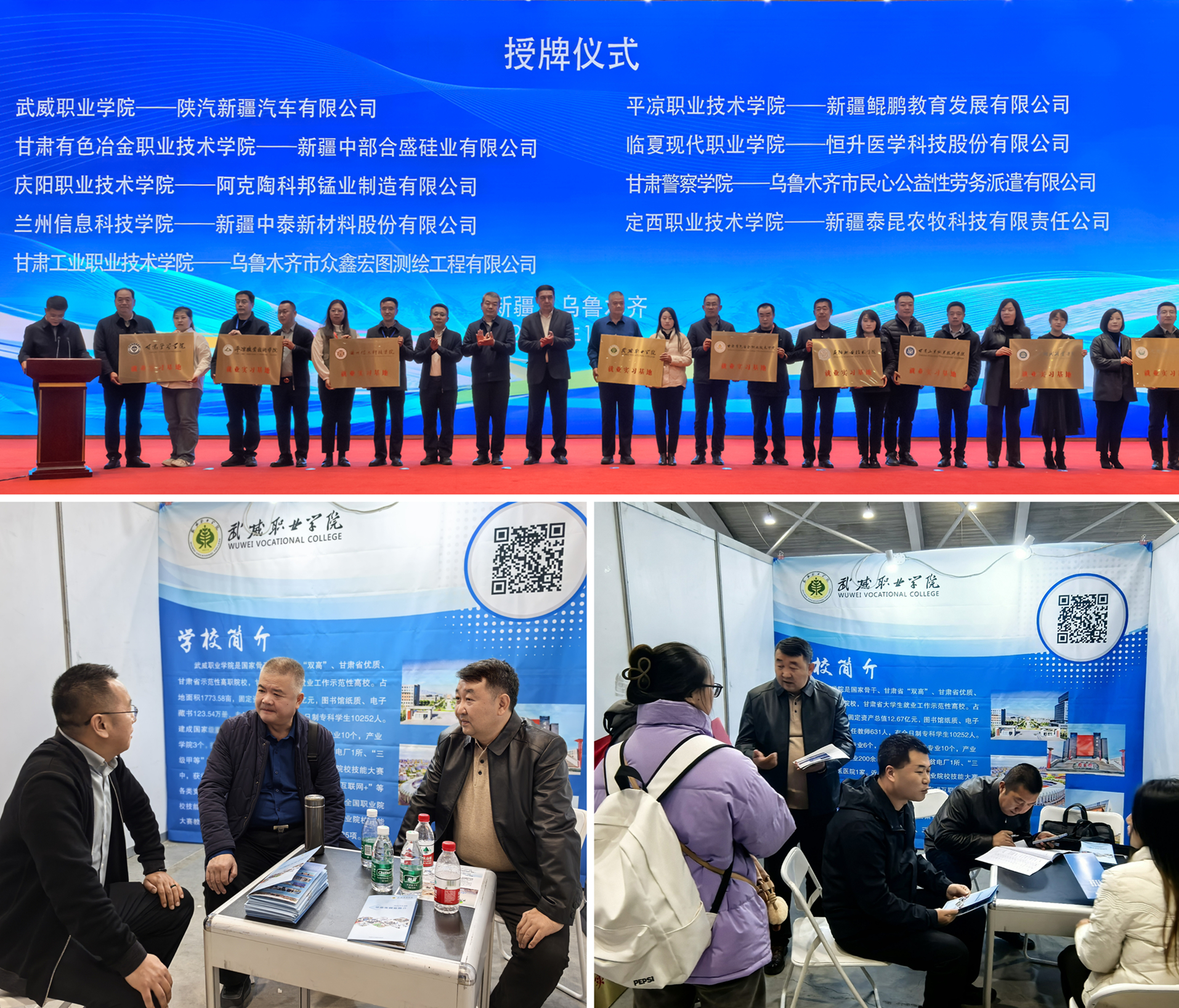 11月1日,召開(kāi)了甘肅省2025屆畢業(yè)生推介會(huì)暨供需對(duì)接“政校企”合作座談會(huì)、甘青新蒙四省(區(qū))八市(州盟)“紅石榴促就業(yè)”訪企拓崗座談會(huì),30余家企事業(yè)單位與學(xué)校就人才招聘、校企合作等方面的內(nèi)容進(jìn)行了深入交流。在“政校企”合作座談會(huì)上,王守云為陜汽新疆汽車有限公司授予武威職業(yè)學(xué)院實(shí)習(xí)就業(yè)基地牌匾。