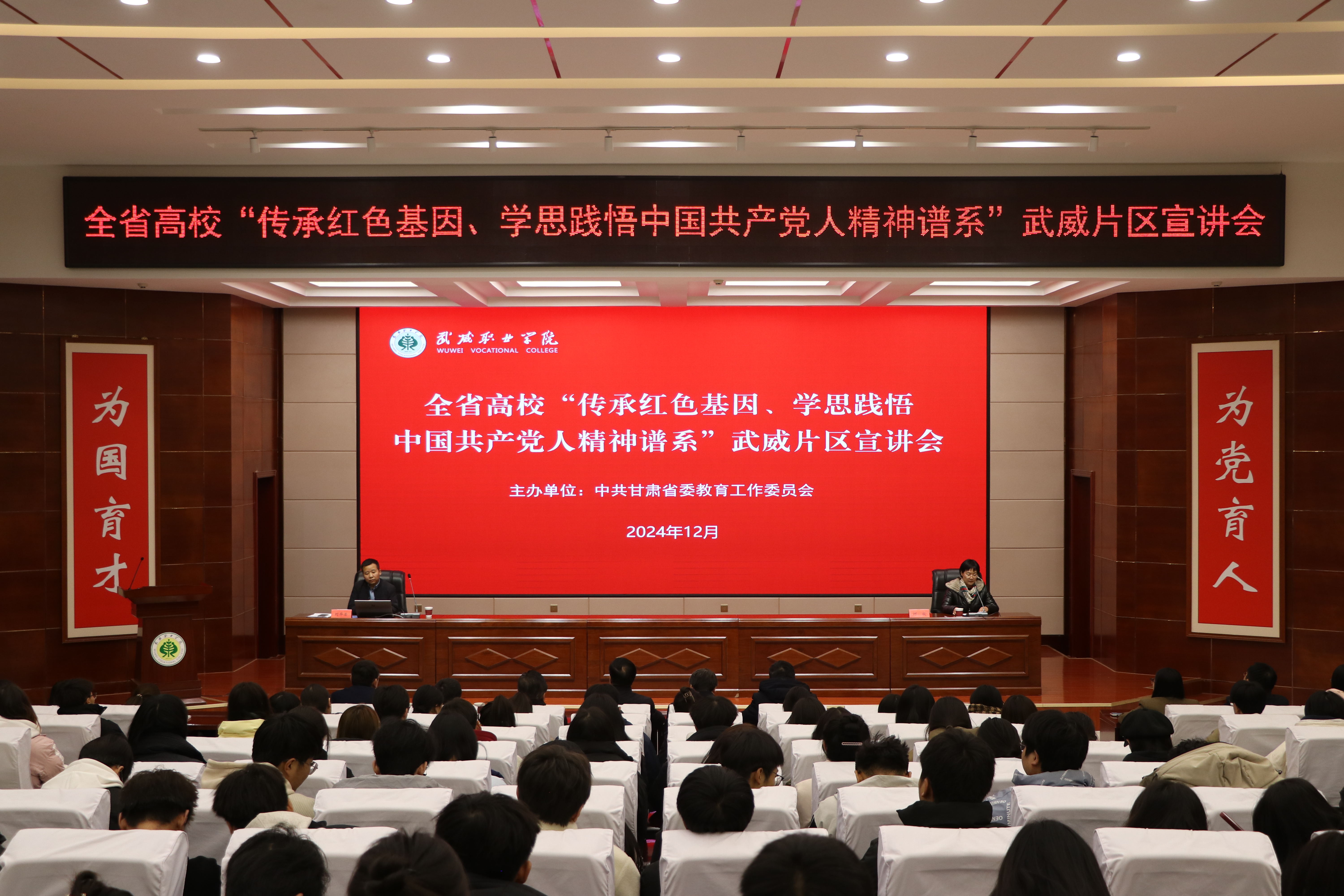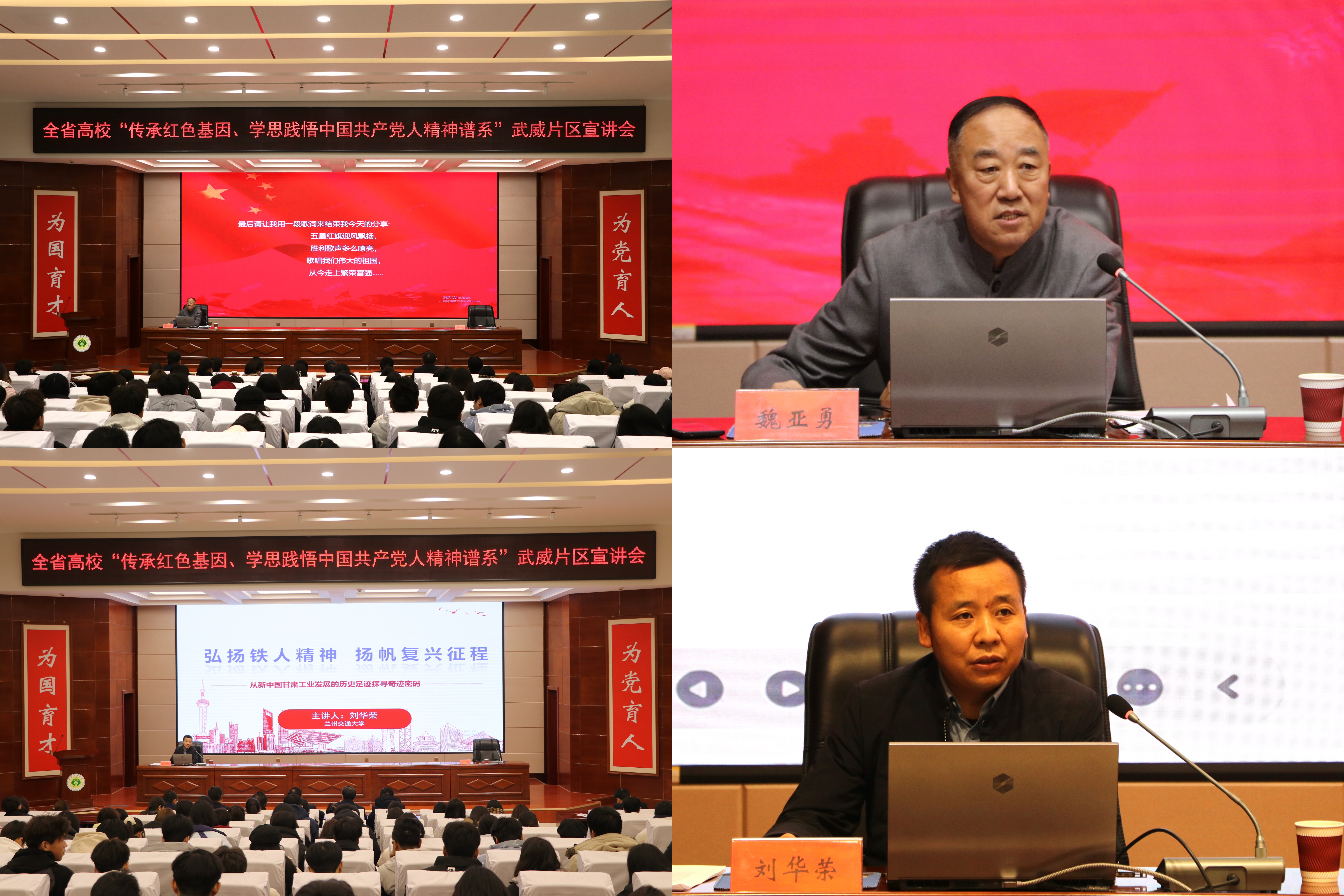 12月12日,由省委教育工委主辦,我校牽頭承辦的全省高校“傳承紅色基因、學(xué)思踐悟中國共產(chǎn)黨人精神譜系”武威片區(qū)宣講會順利舉行。張掖市忠孝文化研習(xí)會會長魏亞勇、蘭州交通大學(xué)馬克思主義學(xué)院副院長劉華榮結(jié)合個人經(jīng)歷,聚焦紅色文化、鐵人精神等開展示范宣講。甘肅畜牧工程職業(yè)技術(shù)學(xué)院和我校師生代表共計200人聆聽了宣講。宣講會由黨委委員、副校長何毅主持。