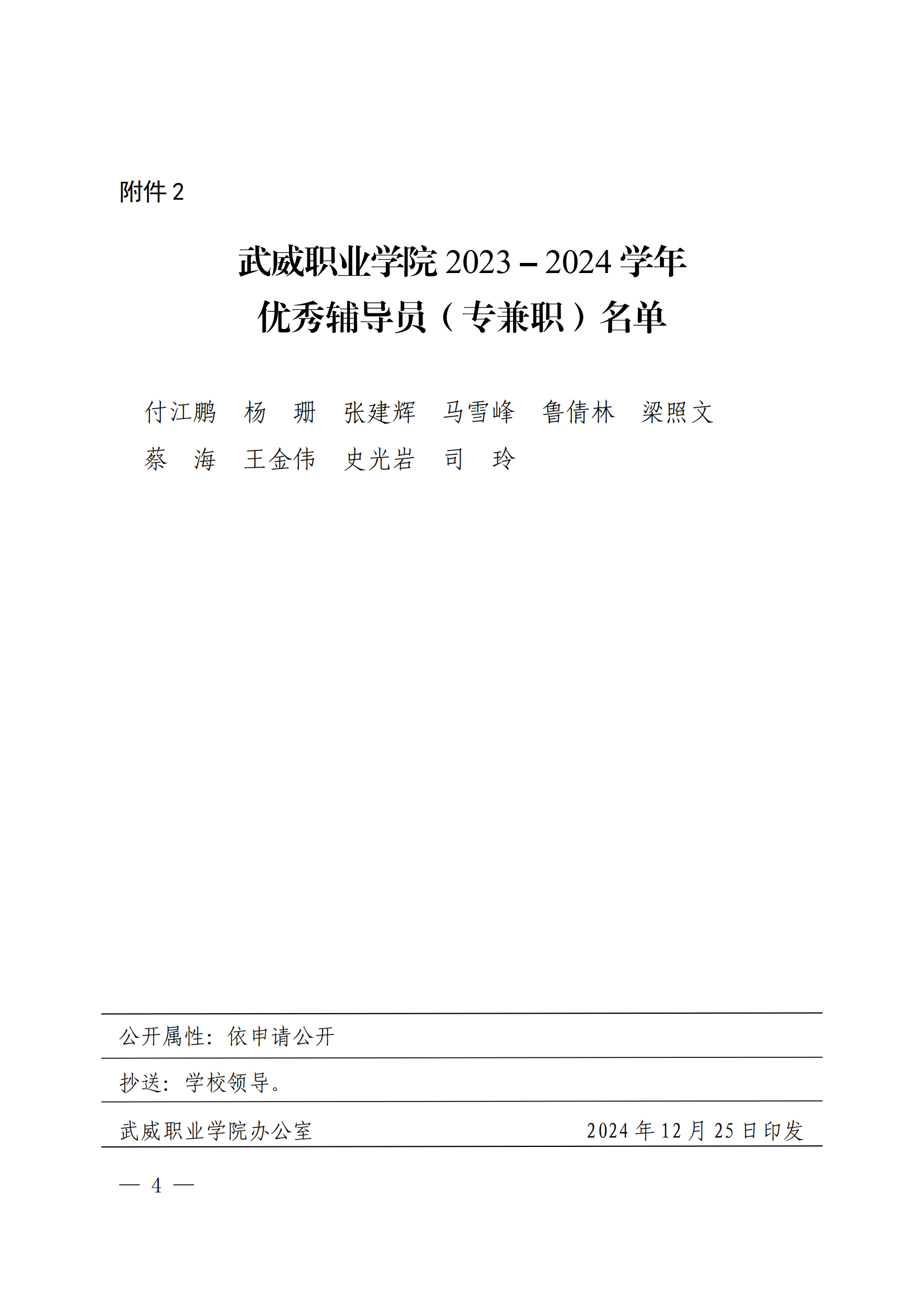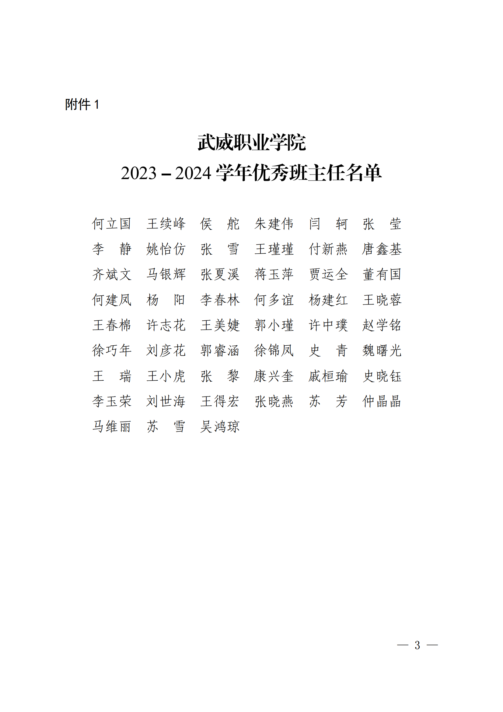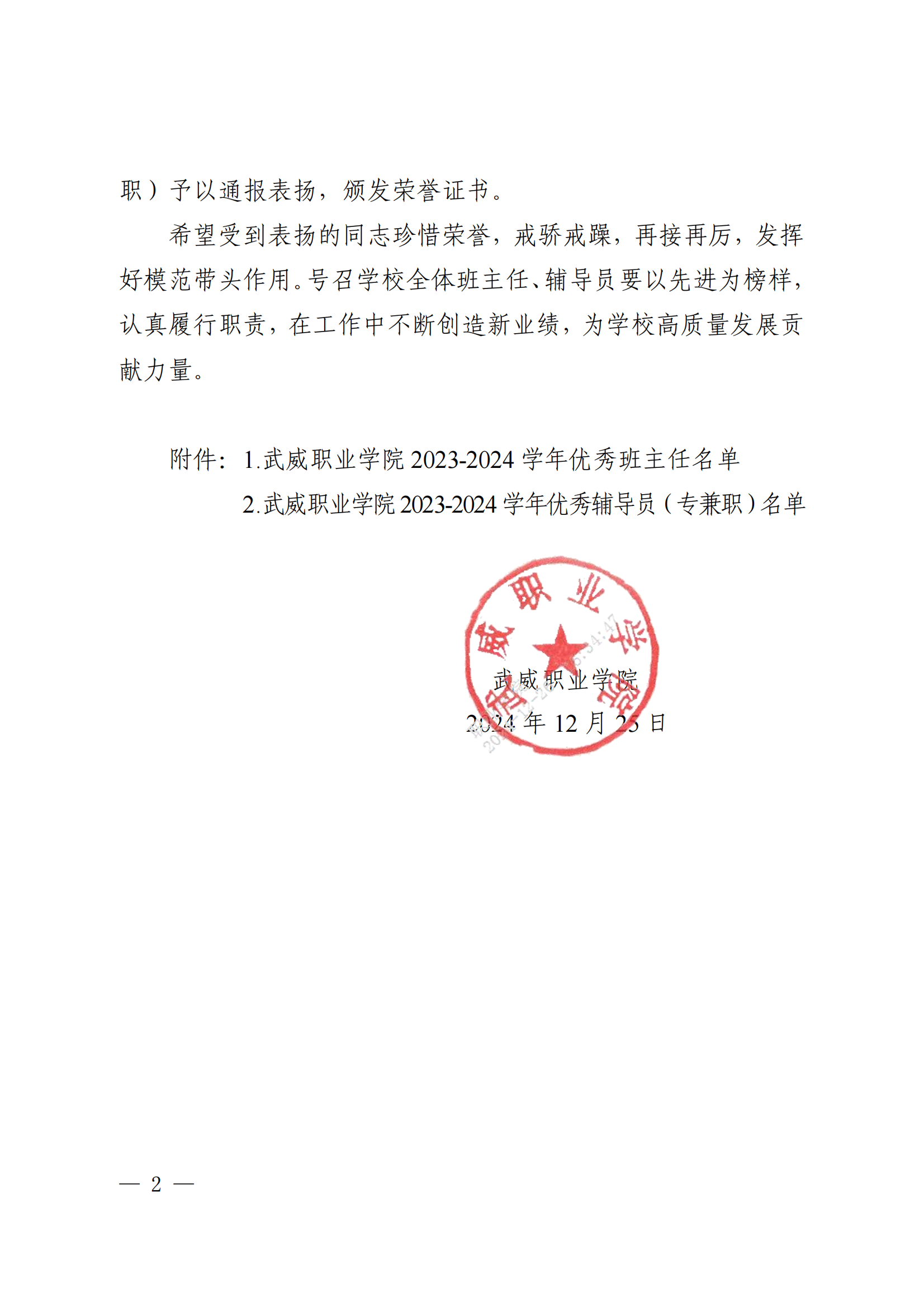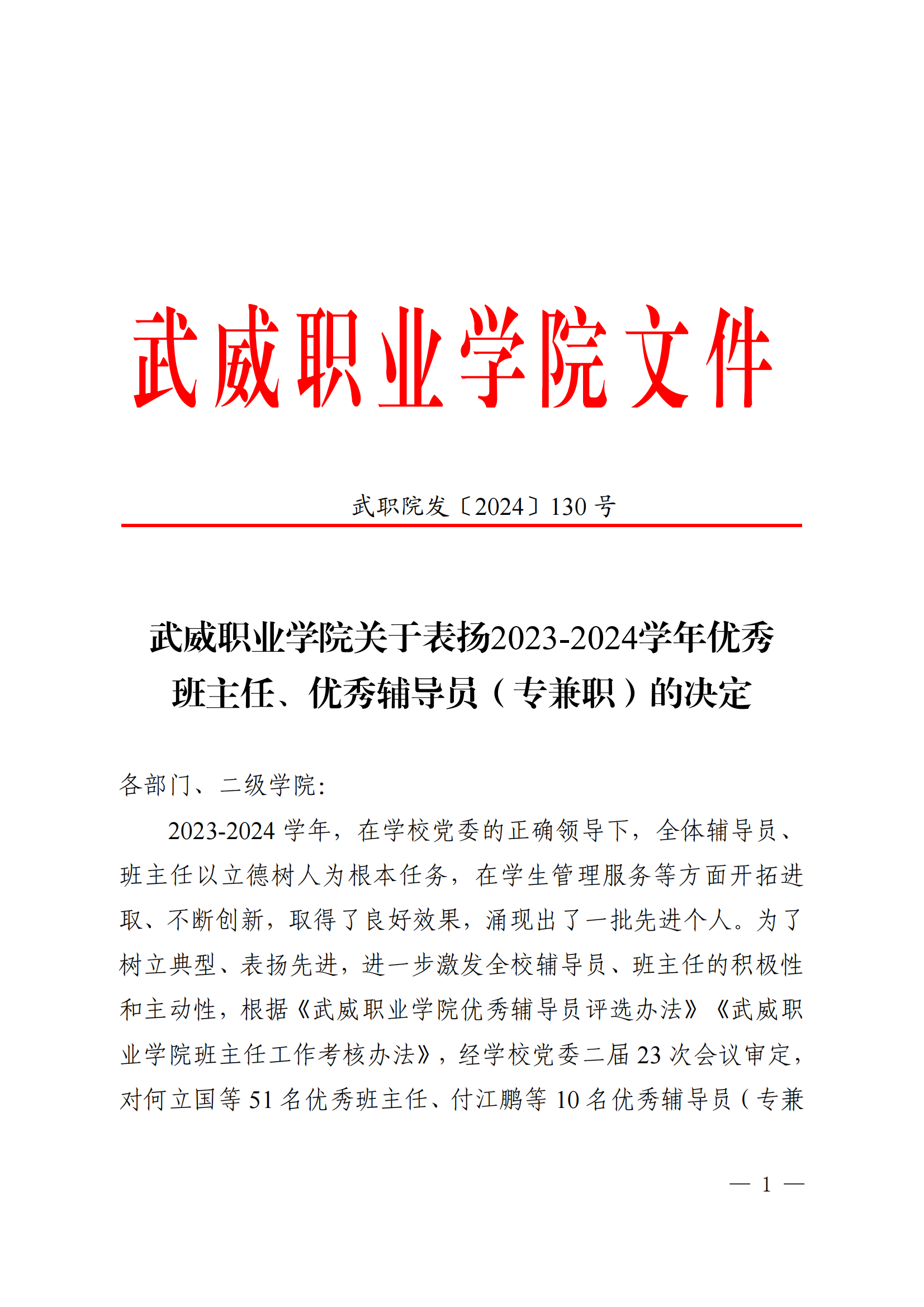武威職業(yè)學(xué)院關(guān)于表?yè)P(yáng)2023-2024學(xué)年優(yōu)秀班主任、優(yōu)秀輔導(dǎo)員(專兼職)的決定