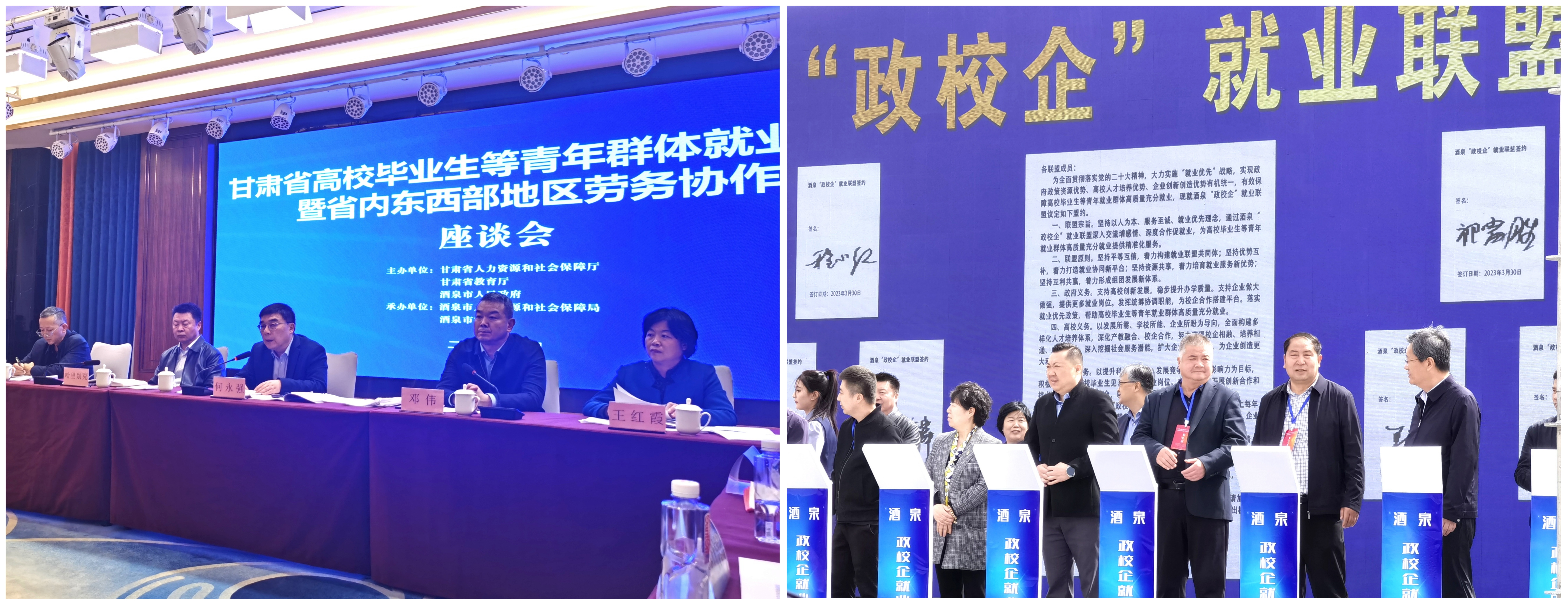 3月30日,王守云帶領招生就業(yè)處、合作教育辦負責人董鵬,在酒泉市參加了由甘肅省人社廳、教育廳組織舉辦的“甘肅省高校畢業(yè)生等青年群體就業(yè)暨省內東西部地區(qū)勞務協作”座談會與招聘會,并進行了政校企就業(yè)聯盟簽約活動。王守云代表武威職業(yè)學院在會上做了題為“政校企聯動深化校企合作,促進畢業(yè)生高質量充分就業(yè)”的交流發(fā)言。