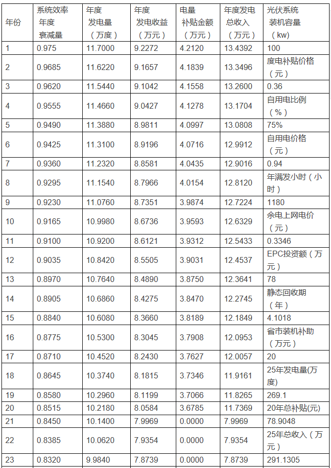 自發(fā)自用時首年/25年總收益分別為9796/204400元,回收期5.92年;全額上網(wǎng)時首年/25年總收益分別為9945/203000元,回收期5.83年。收益持平。