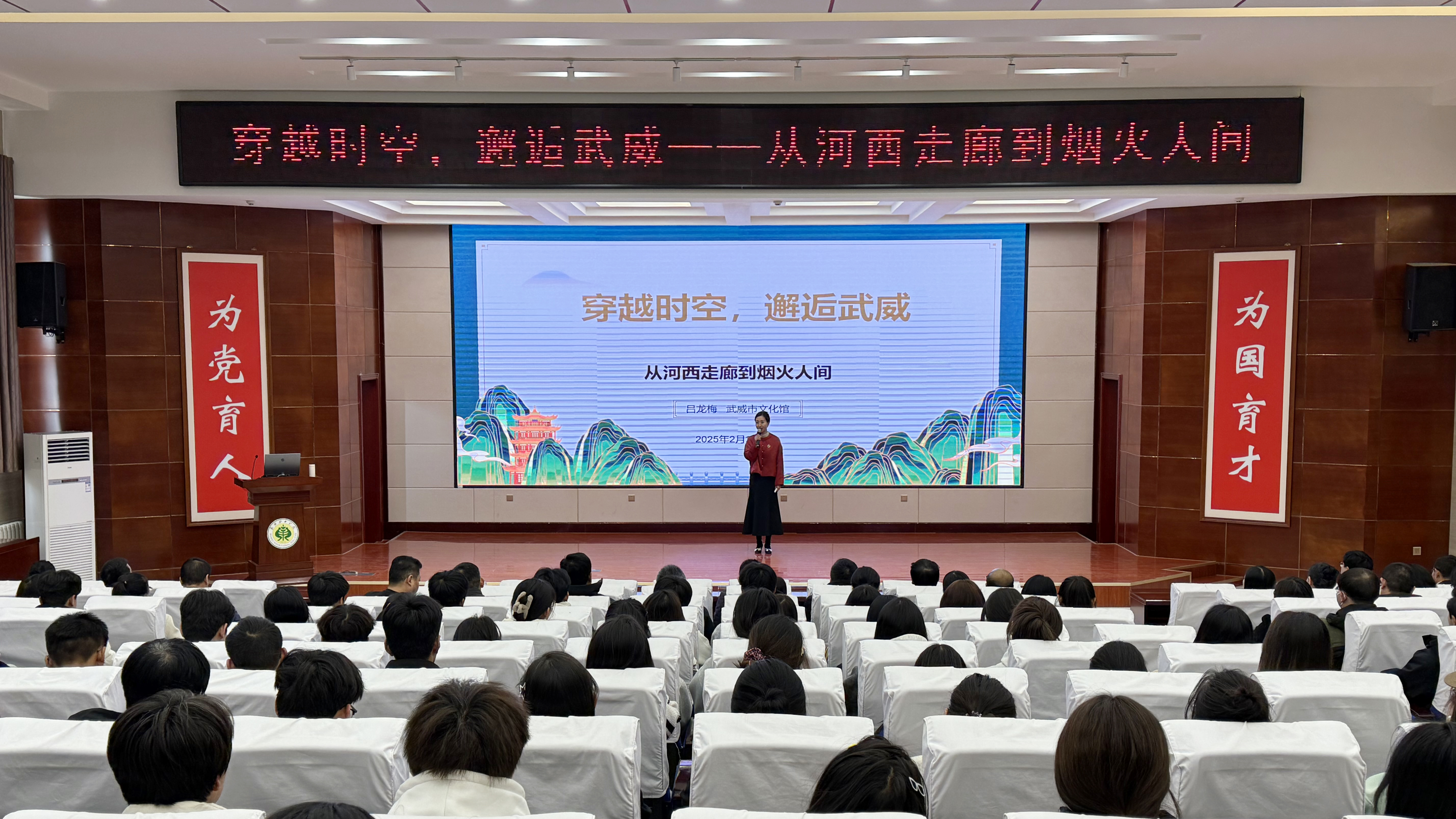 2月28日,校團委特邀甘肅省優(yōu)秀青年文化人才、武威市文化館館長呂龍梅,在學(xué)校菁英廳為師生作了題為《穿越時空,邂逅武威——從河西走廊到煙火人間》的專題講座,學(xué)校師生代表共計200余人參加了活動。