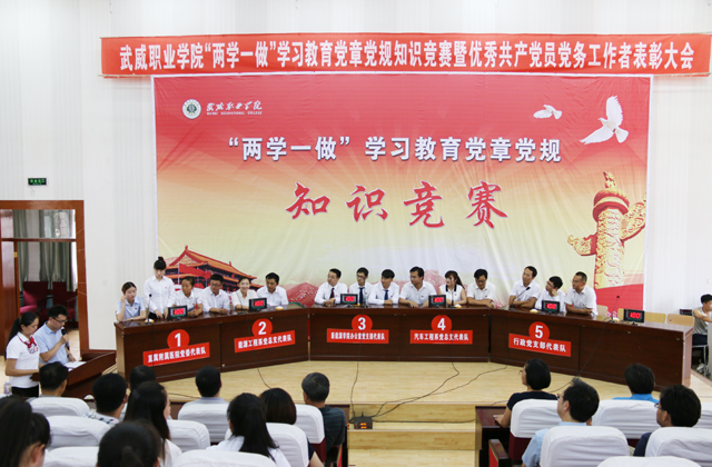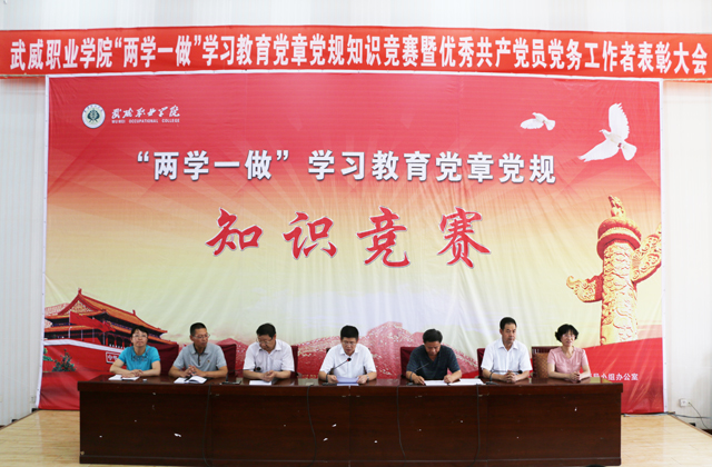 7月6日下午,武威職業(yè)學(xué)院“兩學(xué)一做”學(xué)習(xí)教育黨章黨規(guī)知識(shí)競賽暨優(yōu)秀共產(chǎn)黨員、優(yōu)秀黨務(wù)工作者表彰大會(huì)在尚德樓正德廳召開。黨委書記張國民,黨委副書記趙明,紀(jì)委書記張富國,副院長翟存祥、王永緒、潘玉華、田迎春出席會(huì)議。直屬附屬醫(yī)院黨委主要負(fù)責(zé)同志、各黨總支(直屬黨支部)書記,各部門負(fù)責(zé)人,受表彰的優(yōu)秀共產(chǎn)黨員、優(yōu)秀黨務(wù)工作者以及參加競賽的代表隊(duì)成員共270人參加了知識(shí)競賽活動(dòng)和表彰大會(huì)。表彰大會(huì)由黨委副書記趙明主持。