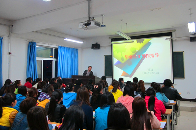 系主任晏素珍對本次畢業(yè)生畢業(yè)論文(設(shè)計)做了三點要求,一是全體畢業(yè)生要高度重視畢業(yè)論文(設(shè)計)的寫作;二是嚴格按照指導教師的要求保質(zhì)保量的完成論文;三是每位指導老師對論文指導工作要認真負責、耐心細致。蔡海老師做了題為《畢業(yè)生論文寫作指導》的報告,主要從論文格式要求、文獻查詢方法、論文寫作方法三個方面給同學們做了深入淺出的講解,受到同學們的熱烈歡迎。