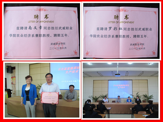 實訓(xùn)工作開幕式上,農(nóng)業(yè)經(jīng)濟系聘請武威市涼州區(qū)農(nóng)技推廣中心高級農(nóng)藝師南文章和羅彩虹同志為武威職業(yè)學(xué)院農(nóng)業(yè)經(jīng)濟系兼職教授。南文章教授為全體師生做了題為《日光溫室蔬菜標(biāo)準(zhǔn)化生產(chǎn)技術(shù)》的專題講座。