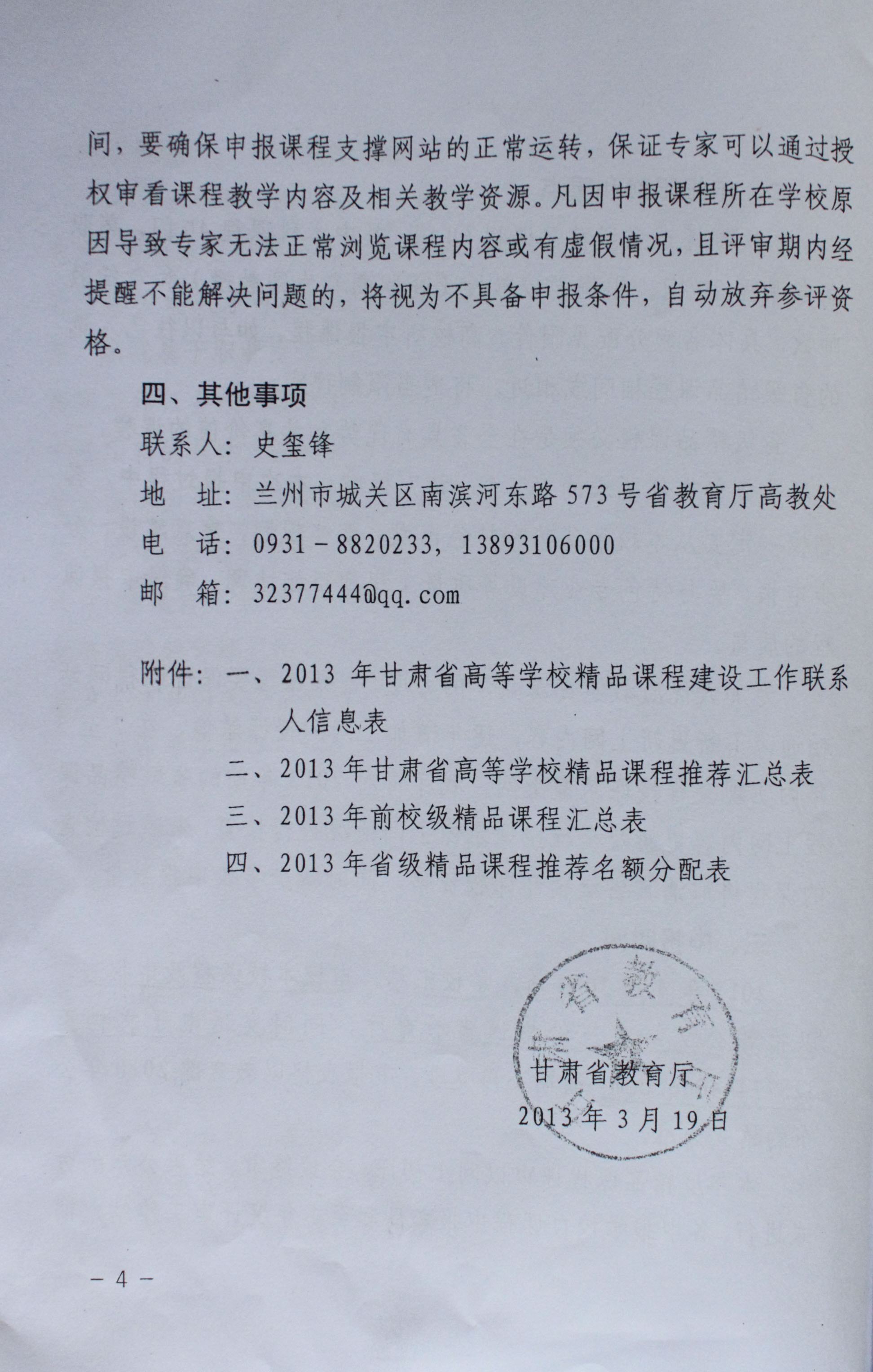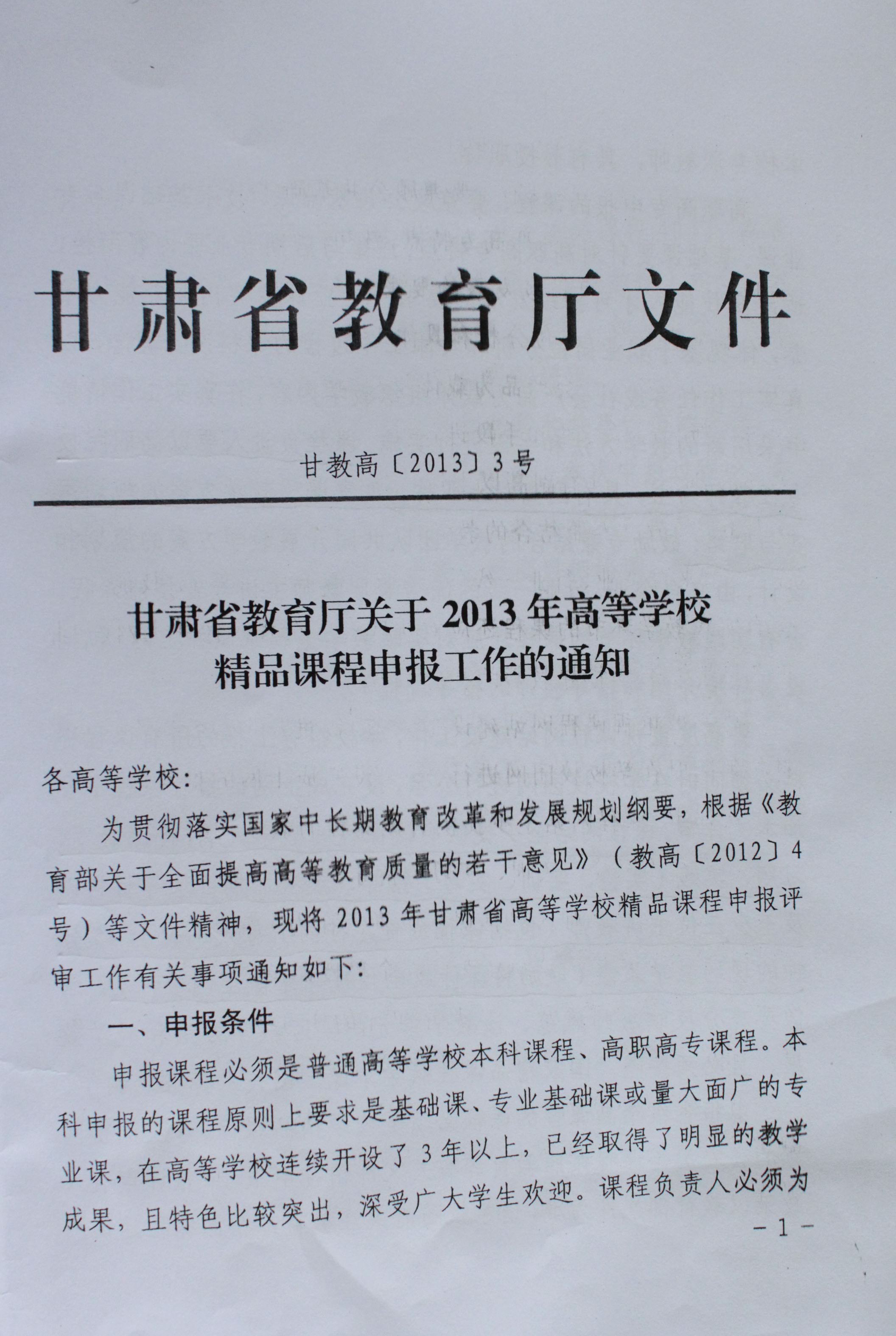 具體申報(bào)條件請(qǐng)參照《甘肅省教育廳關(guān)于2013年高等學(xué)校精品課程申報(bào)工作的通知》(甘教高〔2013〕3號(hào))文件,該文件已上傳至教務(wù)處網(wǎng)站——課程建設(shè)。