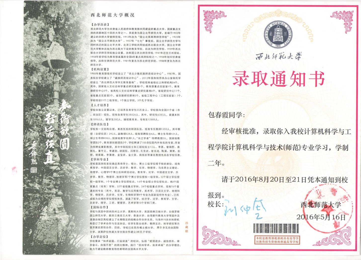 近日傳來喜訊,我系13級(jí)計(jì)算機(jī)應(yīng)用大專班包春霞同學(xué)在2016年甘肅省專升本考試中,被西北師范大學(xué)計(jì)算機(jī)科學(xué)與工程學(xué)院錄取。