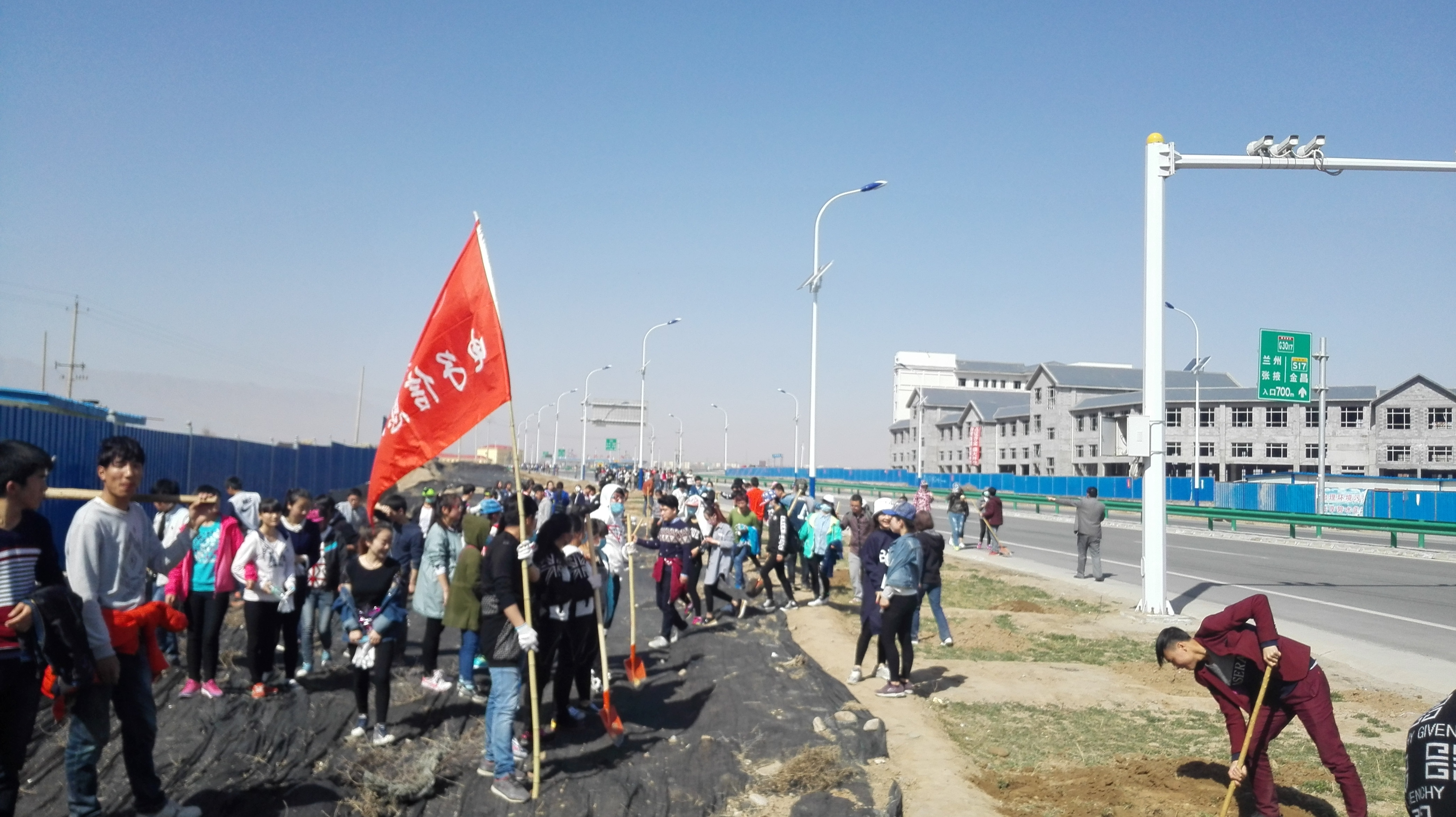 早上8點,全系380名學生拿著勞動工具,排著整齊的隊伍,在老師的帶領下,向勞動區(qū)域出發(fā)。步行半小時后,到達目的地金大路武威北高速入口處。袁書記根據(jù)學院分配的勞動區(qū)域,部署了各班的勞動任務,各班學生以小組的形式在老師的帶領下進行勞動。