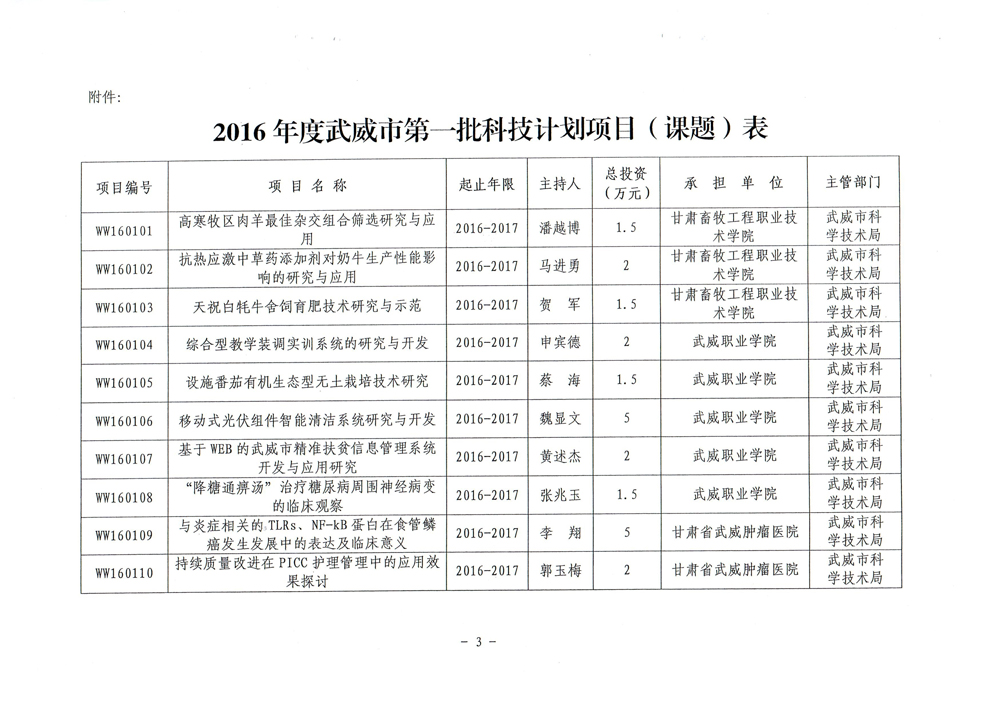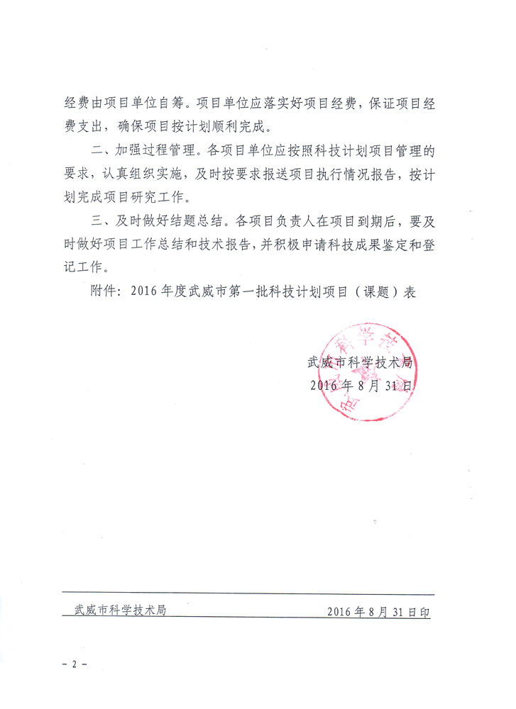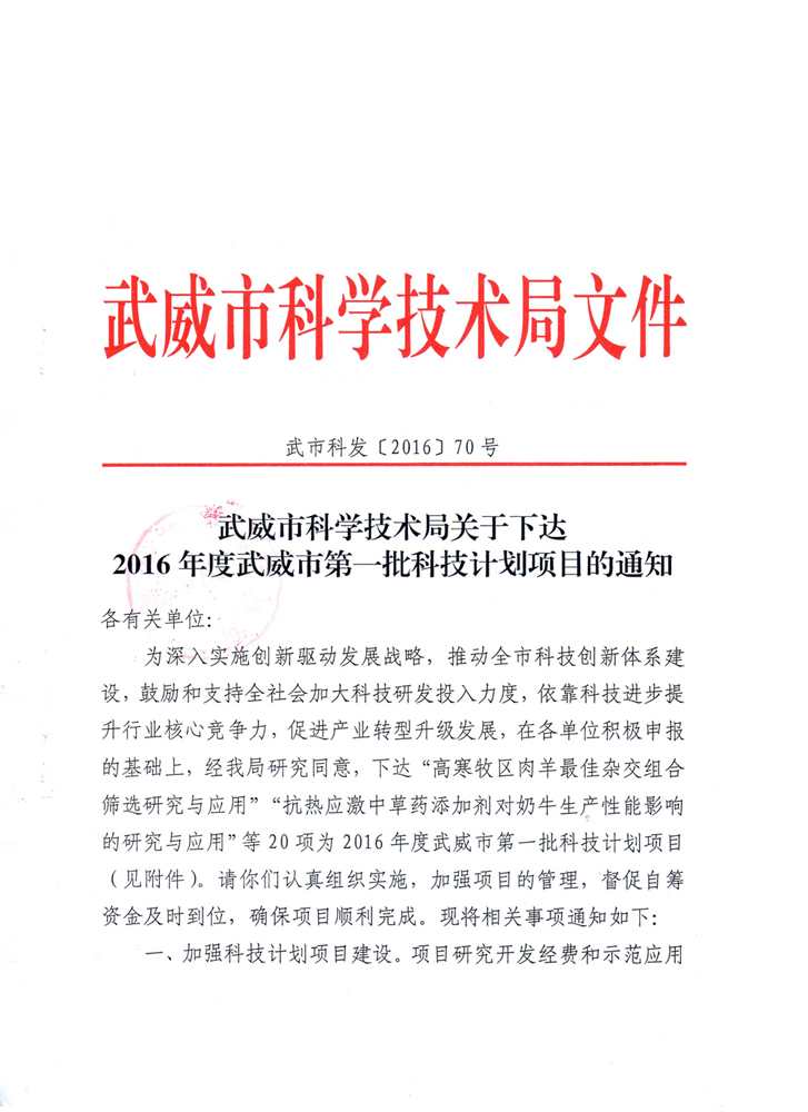 武威市科學技術局關于下達2016年度武威市第一批科技計劃項目的通知