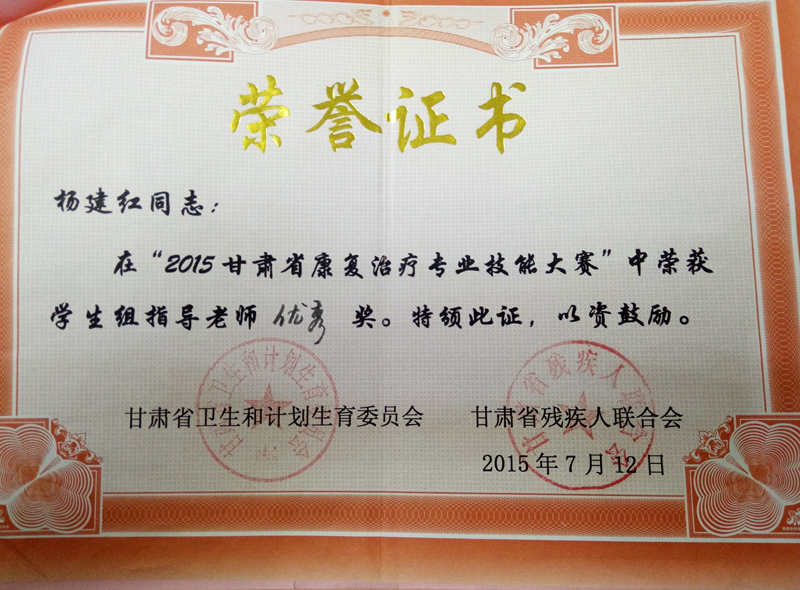 楊建紅榮獲“2015甘肅省康復(fù)治療專業(yè)技能大賽”學生組優(yōu)秀指導教師