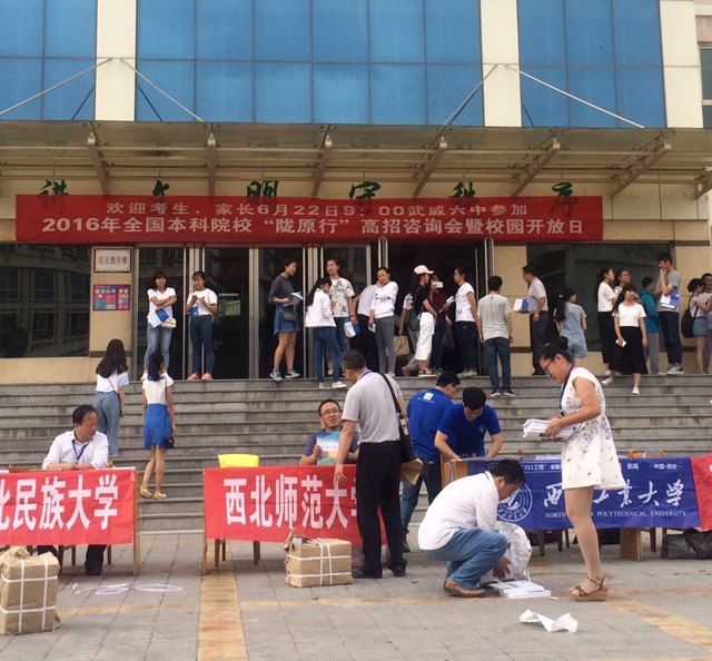 同一天,招生就業(yè)處還選派老師參加了在武威六中舉行的由《未來(lái)導(dǎo)報(bào)》主辦的“2016年全國(guó)本科院?!]原行’高招咨詢會(huì)”,就考生和家長(zhǎng)關(guān)心的相關(guān)熱點(diǎn)問(wèn)題進(jìn)行了現(xiàn)場(chǎng)答疑解惑,考生及家長(zhǎng)表示對(duì)他們掌握各院校熱門(mén)專(zhuān)業(yè)和報(bào)考要求有很大幫助。