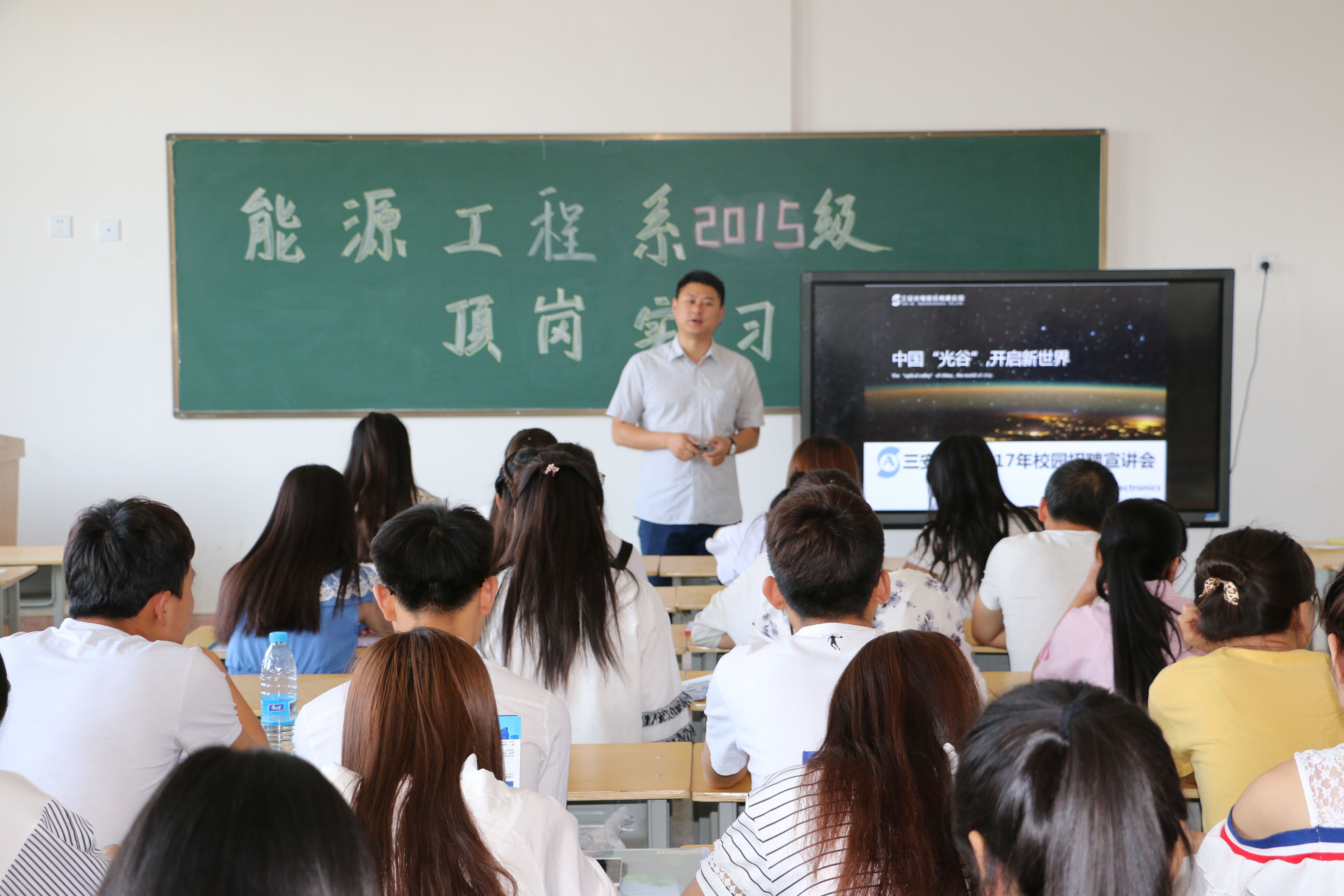 為進(jìn)一步深化校企合作,提供更優(yōu)質(zhì)的頂崗實習(xí)崗位,6月26日早上,能源工程系邀請校企合作企業(yè)安徽三安光電有限公司和晶科能源有限公司工作人員在我系洽談校企合作事宜,并對即將進(jìn)入實習(xí)的2015級學(xué)生做頂崗實習(xí)宣講。