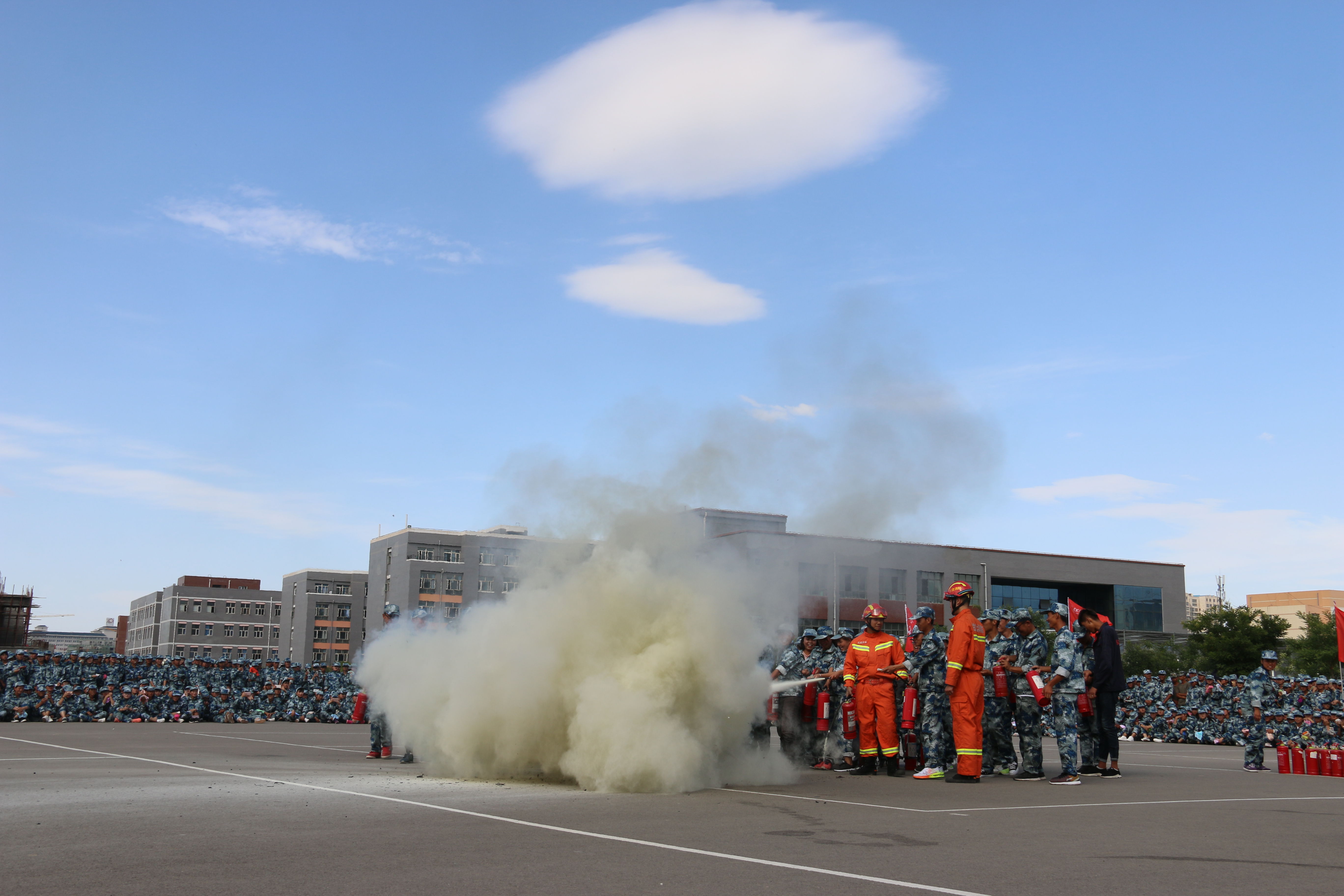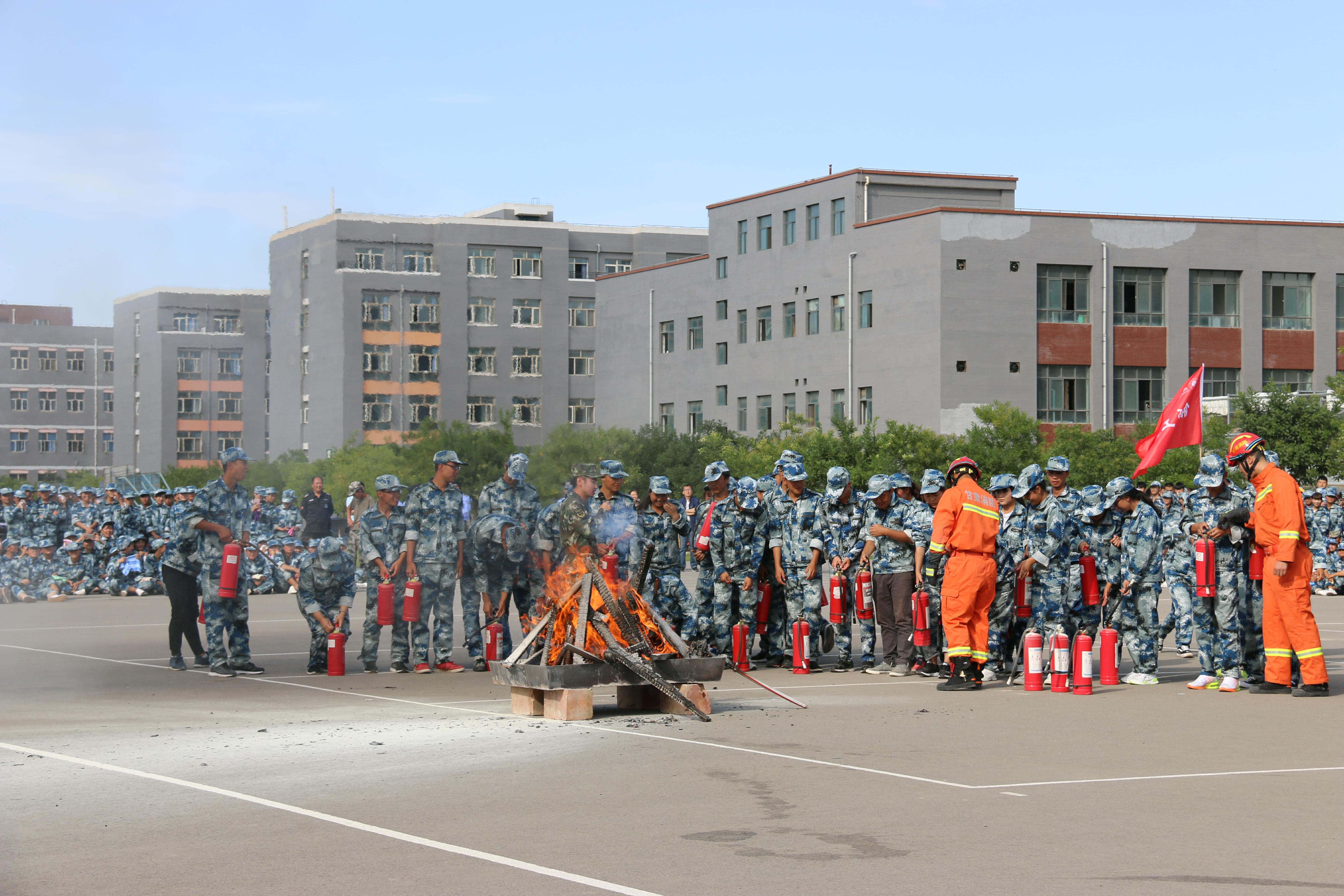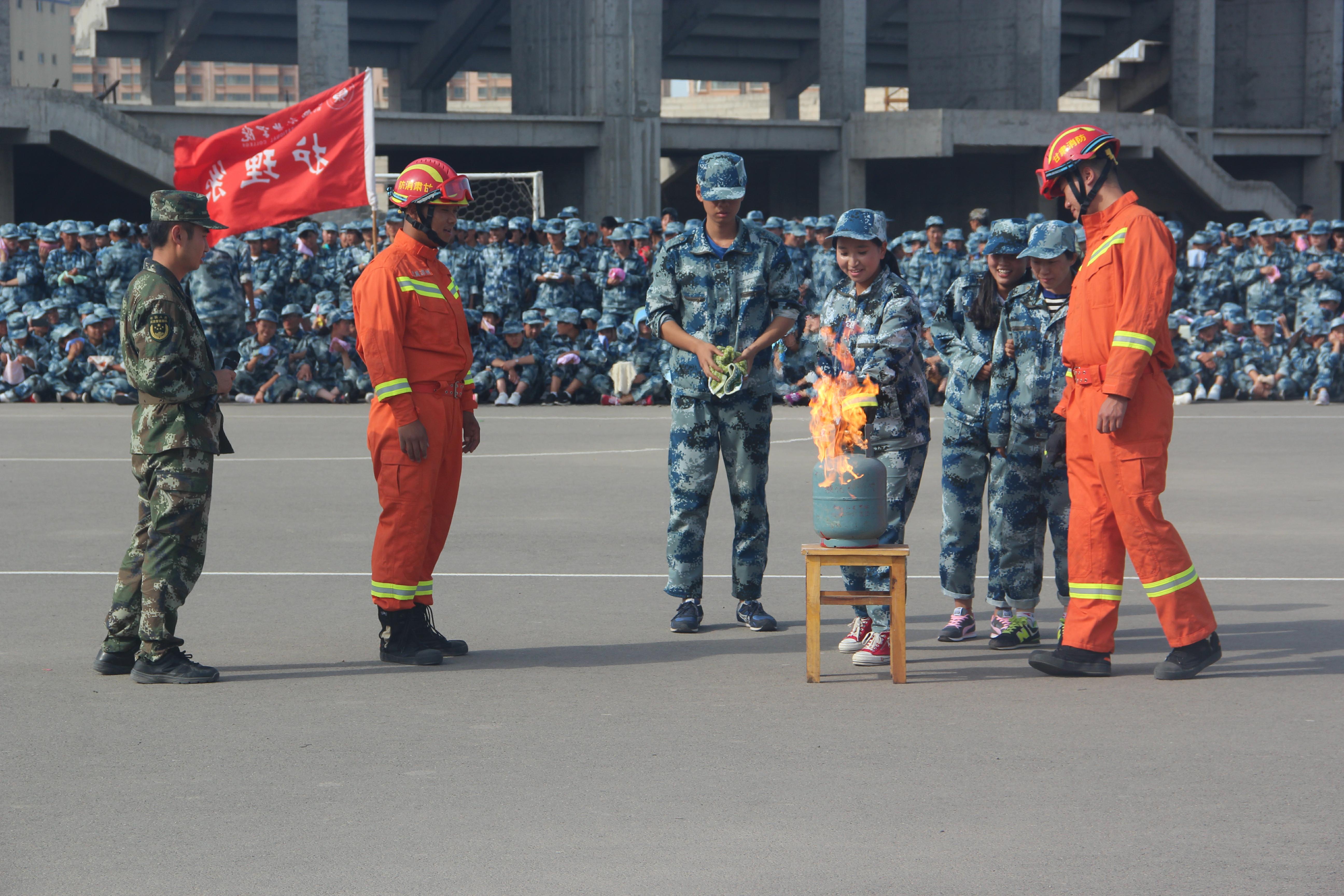 隨后,所有參演學(xué)生整隊(duì)到操場(chǎng)參加了滅火演練。在消防官兵的講解和和示范下,同學(xué)們體驗(yàn)了處置著火液化氣瓶、干粉滅火器滅火,通過模型煙室等操作。