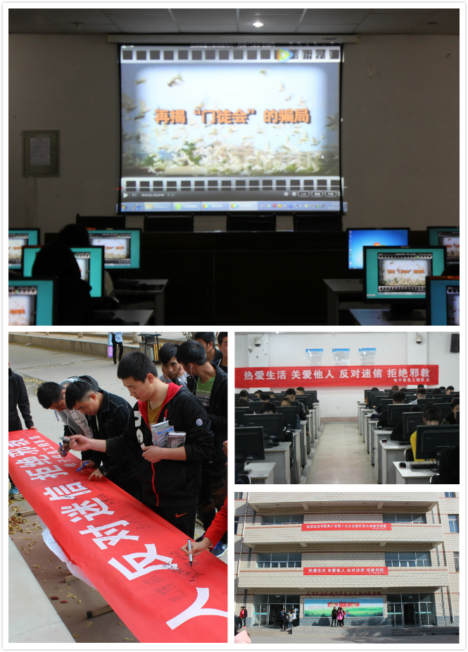 為了建設(shè)和諧校園,維護(hù)社會穩(wěn)定,凈化教育系統(tǒng)校園,電子信息工程于10月30日晚,在尚德樓11號機(jī)房開展了反邪教宣傳片放映活動。