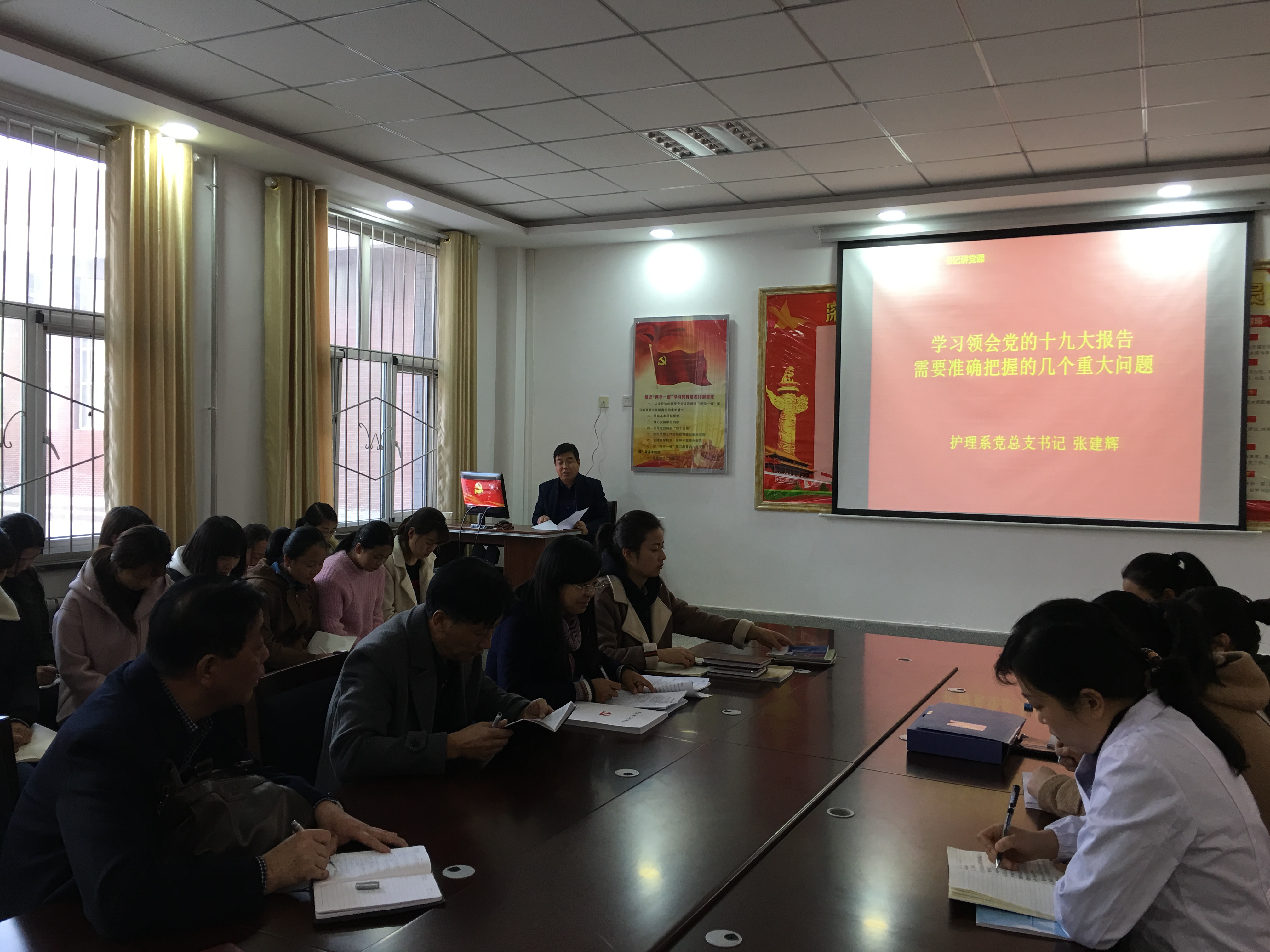護(hù)理系黨總支結(jié)合實(shí)際,利用多種形式組織黨員學(xué)習(xí)和領(lǐng)會(huì)黨的十九大精神,針對(duì)不同黨員的實(shí)際情況,通過(guò)組織開(kāi)展集中學(xué)習(xí)、黨員自學(xué)、支部書(shū)記宣講、專(zhuān)題研討等形式將學(xué)習(xí)宣傳貫徹黨的十九大精神落到實(shí)處,同時(shí)將學(xué)習(xí)宣傳貫徹黨的十九大精神與我系教育教學(xué)工作相結(jié)合,加強(qiáng)基層黨組織組織建設(shè),推動(dòng)優(yōu)質(zhì)高職院校建設(shè)工作全方面有序開(kāi)展。(供稿:護(hù)理系??? 審核:張建輝???? 撰稿:寇明赟??? 圖片:寇明赟)