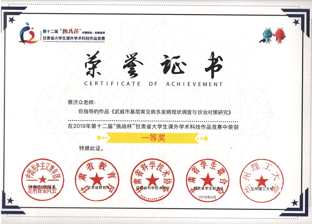 第十二屆“挑戰(zhàn)杯”甘肅省大學生課外學術(shù)科學作品《武威市基層常見病多發(fā)病現(xiàn)狀調(diào)查與診治對策研究》