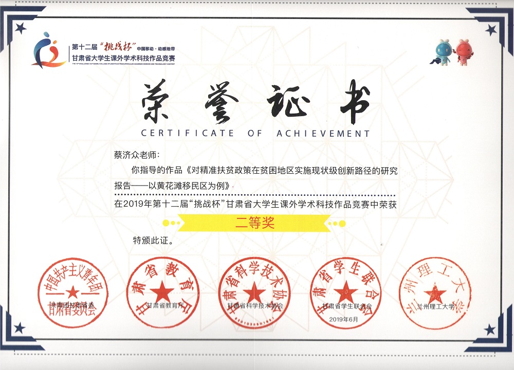 第十二屆“挑戰(zhàn)杯”甘肅省大學生課外學術(shù)科學作品《對精準扶貧政策在貧困地區(qū)實施現(xiàn)狀級創(chuàng)新路徑的研究報告-以黃花灘移民為例》