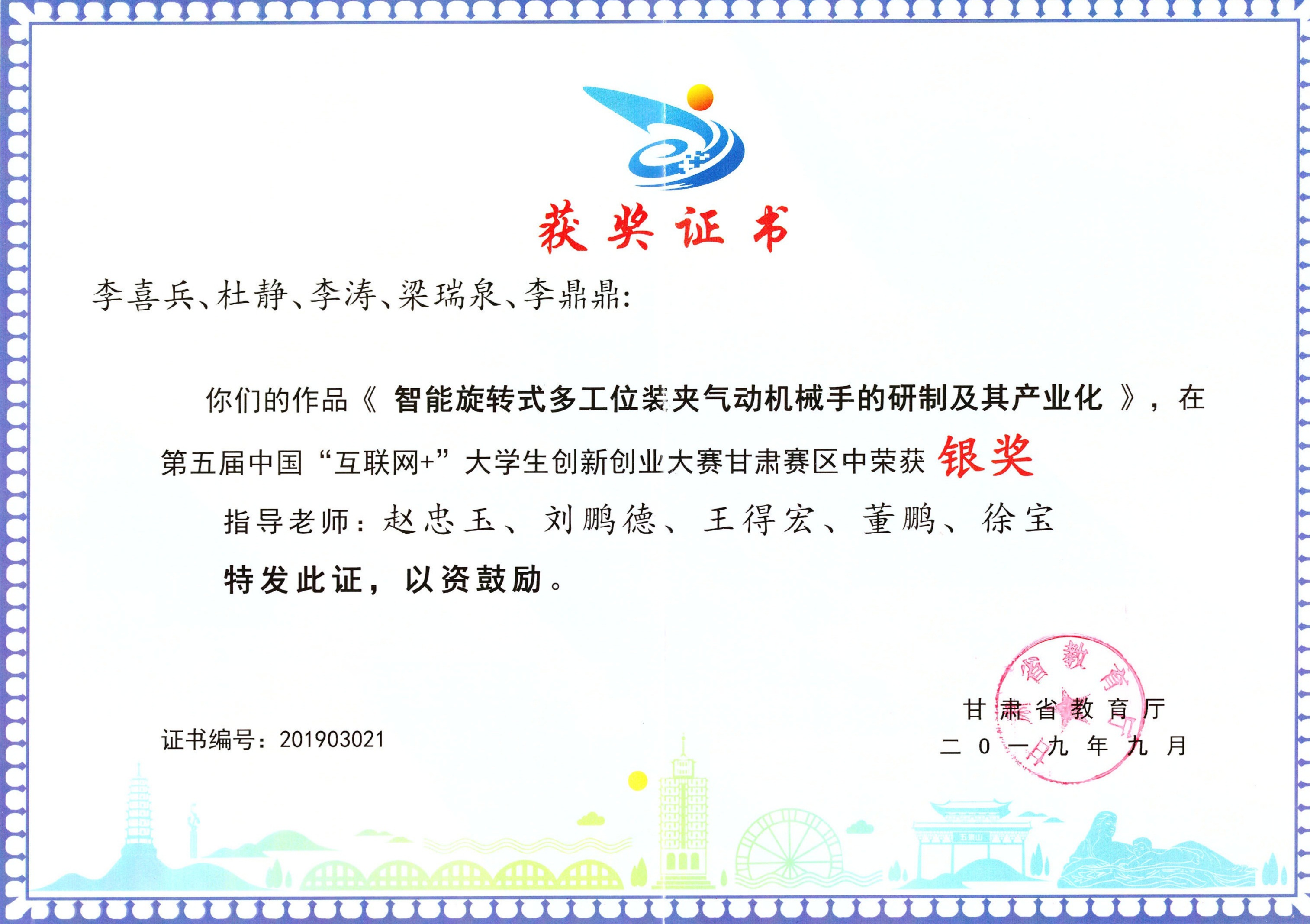 .第五屆中國“互聯(lián)網(wǎng)+”大學生創(chuàng)新創(chuàng)業(yè)大賽甘肅賽區(qū)《智能旋轉(zhuǎn)式多工位裝夾氣動機械手的研制及其產(chǎn)業(yè)化》