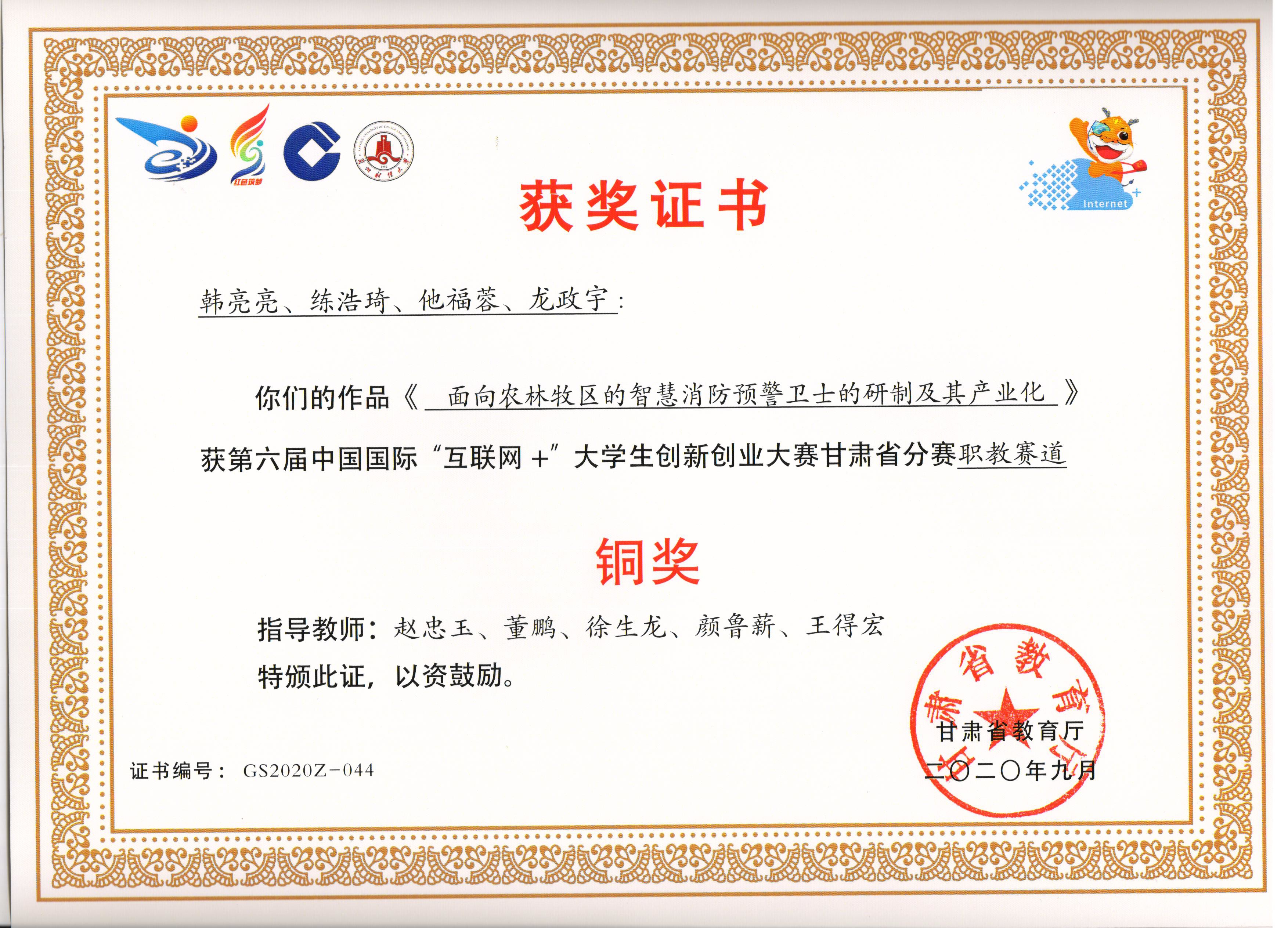 第六屆中國國際“互聯(lián)網(wǎng)+”大學生創(chuàng)新創(chuàng)業(yè)大賽甘肅省分賽職教賽道《面向農(nóng)林牧區(qū)的智慧消防預警衛(wèi)士的研制及其產(chǎn)業(yè)化》