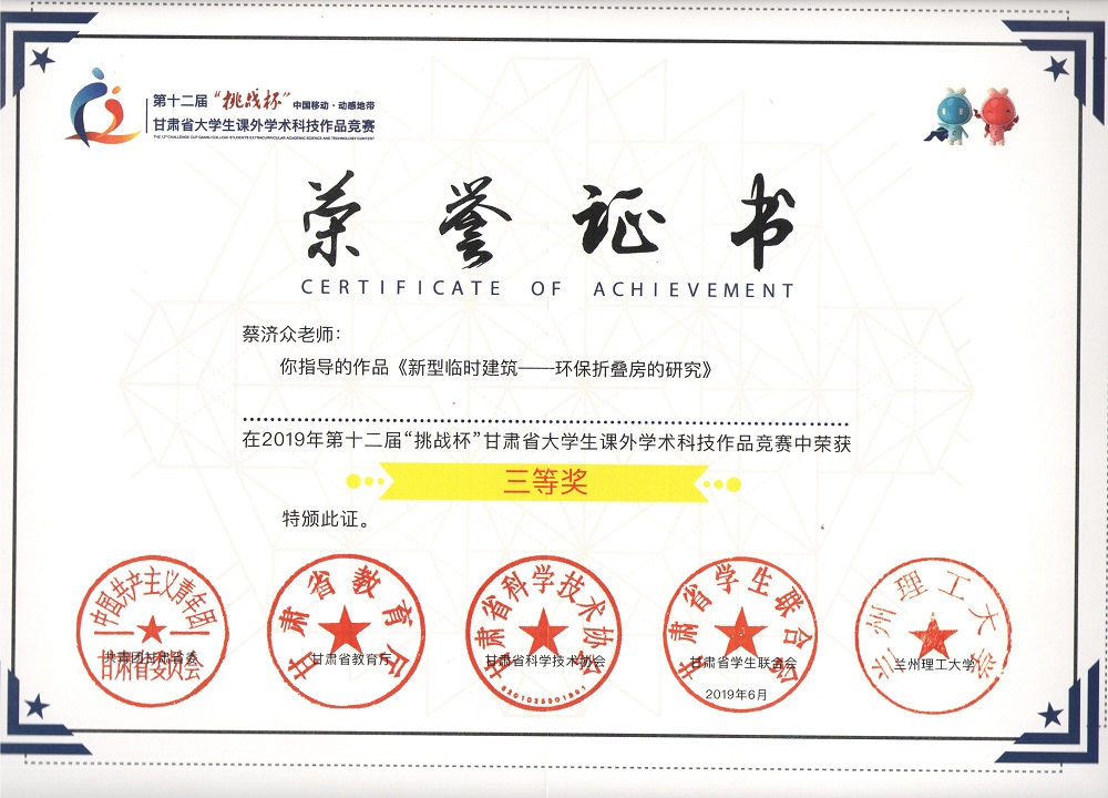 第十二屆“挑戰(zhàn)杯”甘肅省大學生課外學術(shù)科學作品《新型臨時建筑—環(huán)保折疊房的研究》