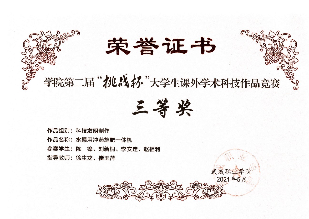 武威職業(yè)學院第二屆“挑戰(zhàn)杯”大學生課外學術(shù)科技作品《水渠用沖藥施肥一體機》