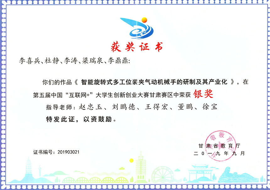 第五屆中國“互聯(lián)網(wǎng)+”大學(xué)生創(chuàng)新創(chuàng)業(yè)大賽甘肅賽區(qū)《智能旋轉(zhuǎn)式多工位裝夾氣動(dòng)機(jī)械手的研制及其產(chǎn)業(yè)化》
