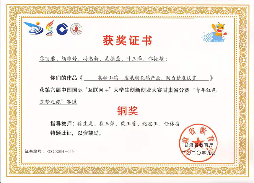 第六屆中國國際“互聯(lián)網(wǎng)+”大學(xué)生創(chuàng)新創(chuàng)業(yè)大賽甘肅省分賽“青年紅色筑夢(mèng)之旅”賽道《蒼松山鴿-發(fā)展特色鴿產(chǎn)業(yè)、助力精準(zhǔn)脫貧》
