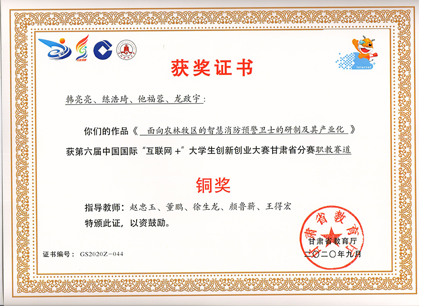第六屆中國國際“互聯(lián)網(wǎng)+”大學生創(chuàng)新創(chuàng)業(yè)大賽甘肅省分賽職教賽道《面向農(nóng)林牧區(qū)的智慧消防預警衛(wèi)士的研制及其產(chǎn)業(yè)化》
