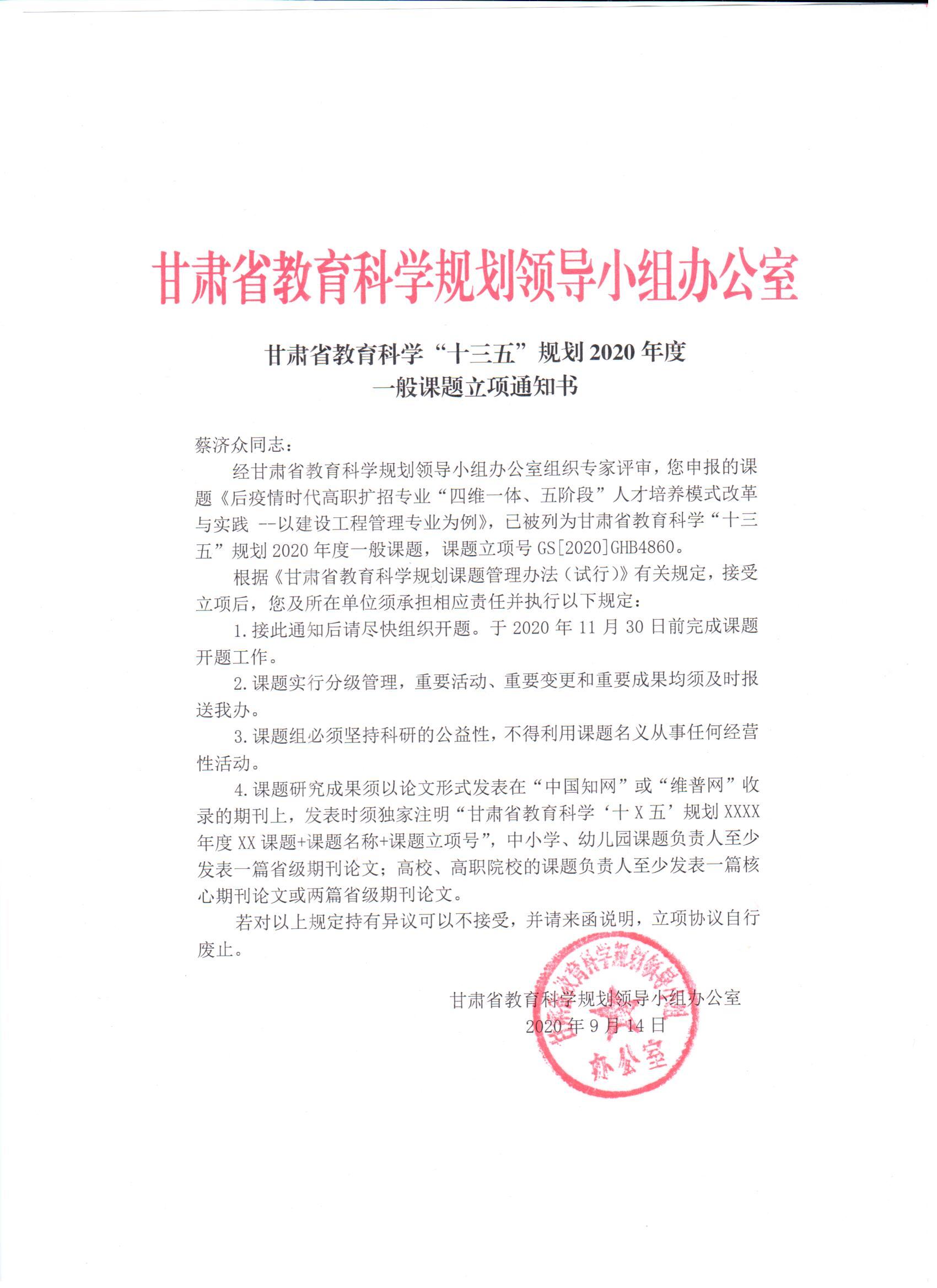 1.2020年項(xiàng)目組成員蔡濟(jì)眾、康興奎申報(bào)甘肅省“十三五”教育規(guī)劃課題《后疫情時(shí)代高職擴(kuò)招專(zhuān)業(yè)“四維一體、五階段”人才培養(yǎng)改革與實(shí)踐-以建設(shè)工程管理專(zhuān)業(yè)為例》 立項(xiàng) 【立項(xiàng)通知書(shū)】