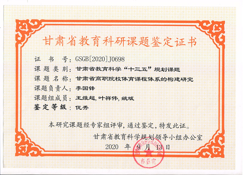 6.2020年項(xiàng)目組成員李國(guó)鋒完成甘肅省教育科學(xué)“十三五”規(guī)劃課題《甘肅省高職院校體育課程體系的構(gòu)建研究》已結(jié)項(xiàng)獲優(yōu)秀獎(jiǎng) 【鑒定證書(shū)】
