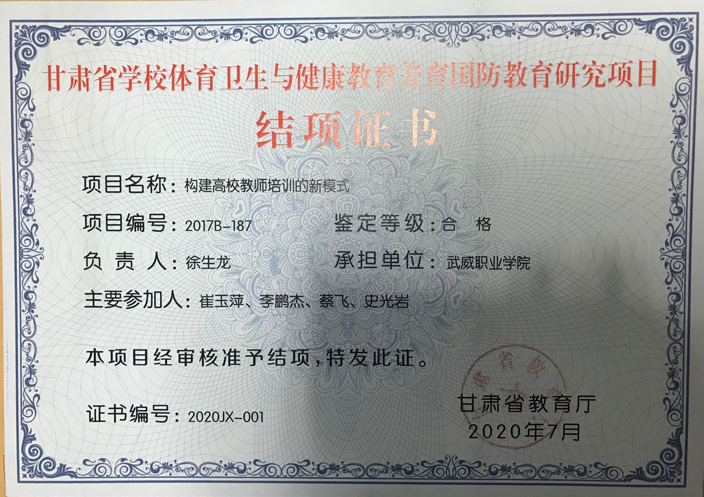 9.2020年項(xiàng)目組成員徐生龍主持完成甘肅省學(xué)校體育衛(wèi)生與健康教育美育國(guó)防教育研究項(xiàng)目《構(gòu)建高校教師培訓(xùn)的新模式》 結(jié)項(xiàng) 【結(jié)項(xiàng)證書(shū)】
