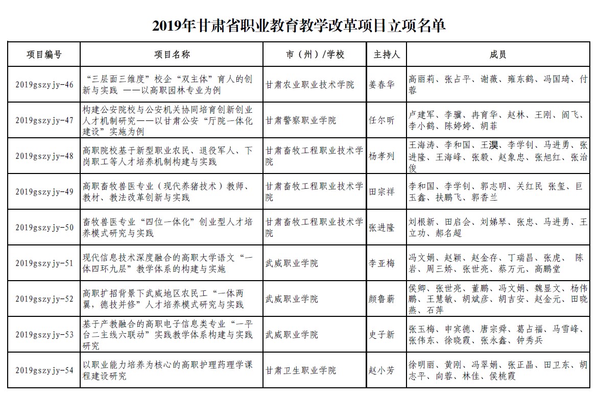 11.2019年項(xiàng)目組成員董鵬參加職業(yè)教育改革研究項(xiàng)目《高職擴(kuò)招背景下武威地區(qū)農(nóng)民工“一體兩翼,德技并修”人才培養(yǎng)模式研究與實(shí)踐》結(jié)項(xiàng)【立項(xiàng)通知】 【立項(xiàng)名單】