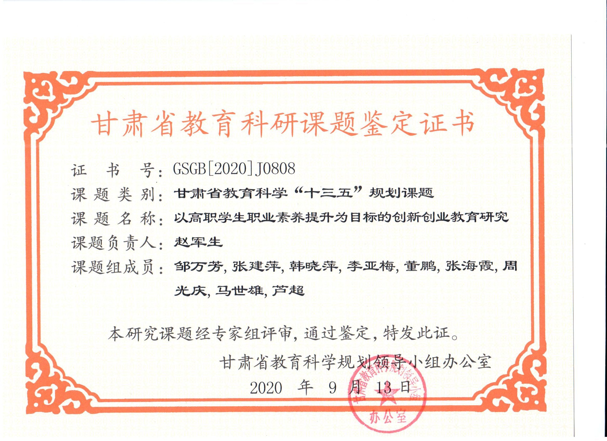 13.2020年項(xiàng)目組成員董鵬完成甘肅省教育科學(xué)“十三五”規(guī)劃課題《以高職學(xué)生職業(yè)素養(yǎng)提升為目標(biāo)的創(chuàng)新創(chuàng)業(yè)教育研究》 結(jié)項(xiàng) 【鑒定證書(shū)】