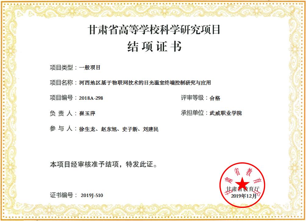 19.2019年項(xiàng)目組成員崔玉萍主持完成甘肅省高等學(xué)??茖W(xué)研究項(xiàng)目《河西地區(qū)基于物聯(lián)網(wǎng)技術(shù)的日光溫室終端控制研究與應(yīng)用》 結(jié)項(xiàng) 【結(jié)項(xiàng)證書(shū)】