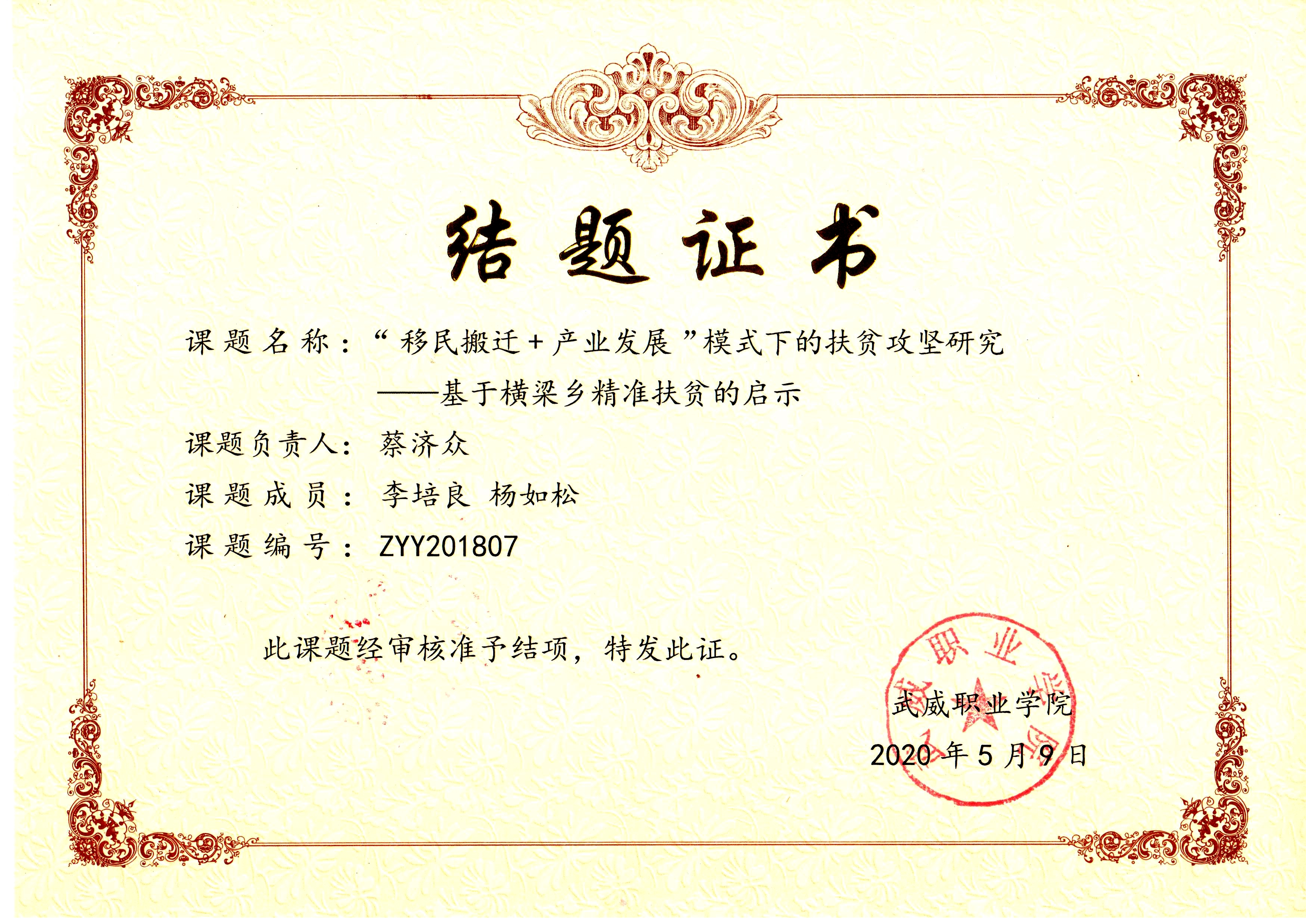 25.2020年項(xiàng)目組成員蔡濟(jì)眾主持完成院級(jí)科研項(xiàng)目《“移民搬遷+產(chǎn)業(yè)發(fā)展”模式下的扶貧攻堅(jiān)研究--基于橫梁鄉(xiāng)精準(zhǔn)扶貧的啟示》 結(jié)項(xiàng) 【結(jié)題證書(shū)】