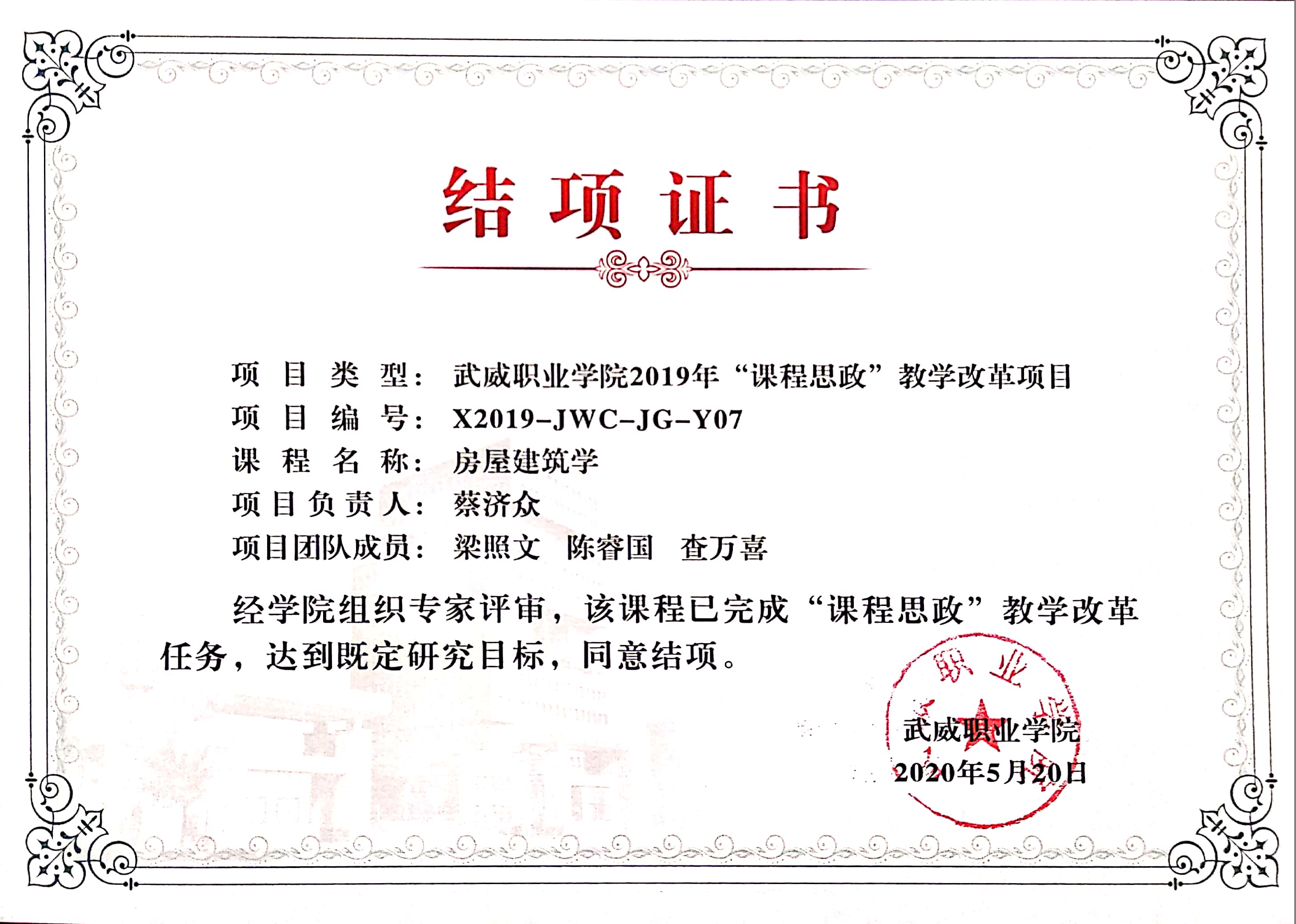 26.2020年項(xiàng)目組成員蔡濟(jì)眾、陳睿國(guó)主持完成《房屋建筑學(xué)》課程思政改革? 結(jié)項(xiàng) 【結(jié)項(xiàng)證書(shū)】