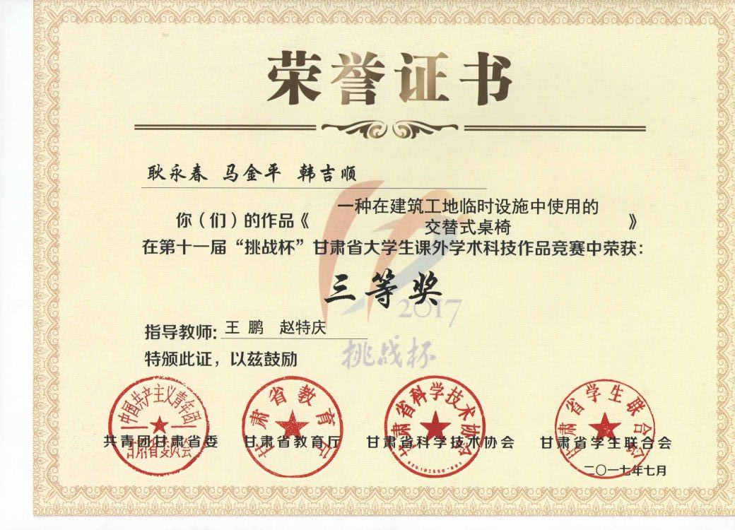 第十一屆“挑戰(zhàn)杯”甘肅省大學(xué)生課外學(xué)術(shù)科學(xué)作品《一種在建筑工地臨時(shí)設(shè)施中使用的交替式桌椅》